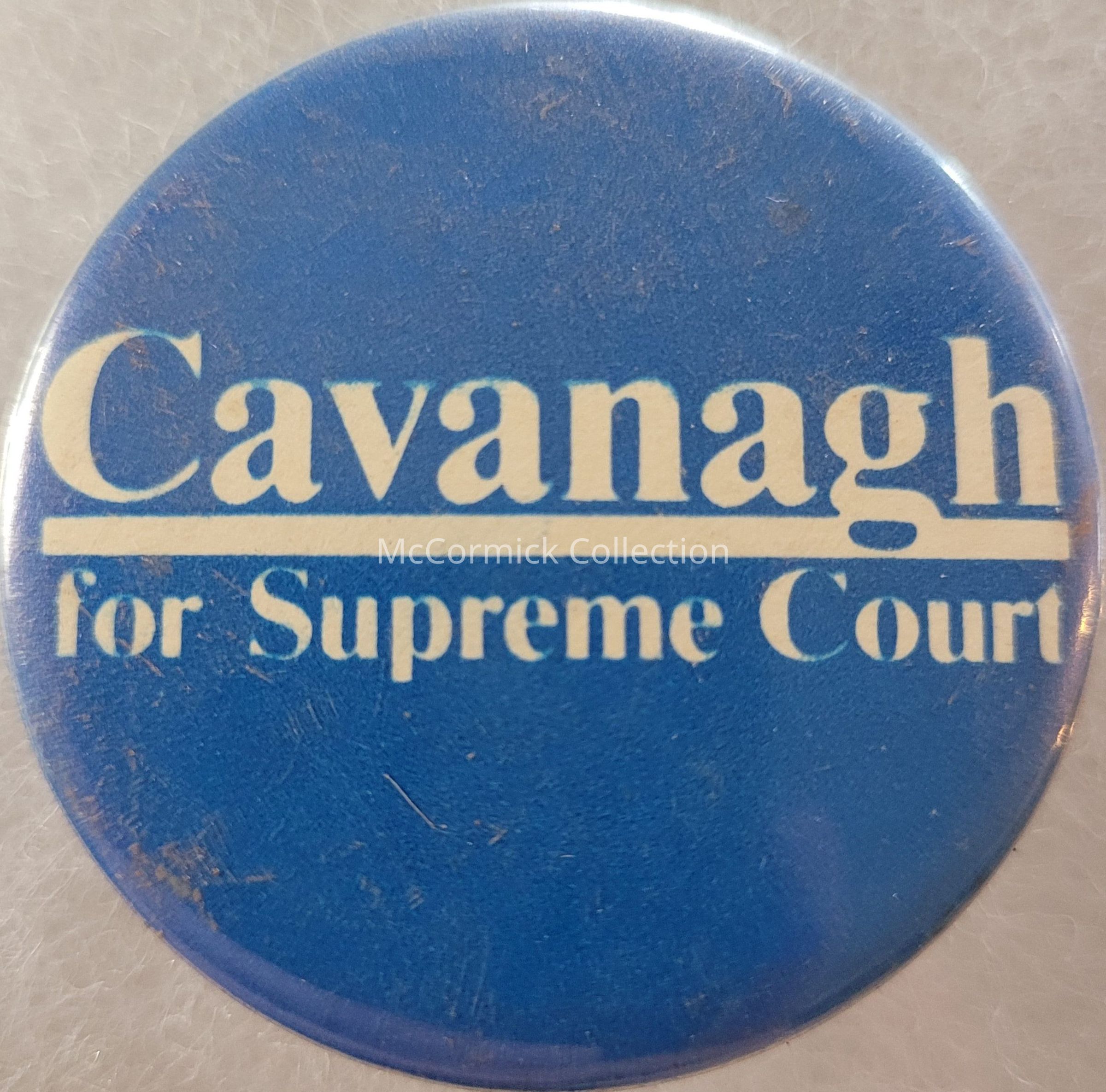A 1.75" blue and white political button for Cavanagh for Supreme Court. This is likely Michael Cavanagh, justice and chief justice of the Michigan Supreme Court, father of Michigan Supreme Court Justice Megan Cavanagh, and brother of Detroit Mayor Jerome P. Cavanagh.