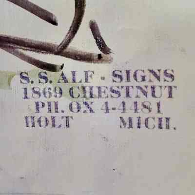 A large hand-painted banner on canvas for the Lansing, Michigan, centennial celebration of 1959, by Holt artist and sign painter Sterling Silver Alf. The banner reads: "Pioneers of 1859 / Chapter No. 64 / Brothers of the Brush" with nods to Lansing on the street signs of Washington and Michigan and the wagon reading "Lansing or Bust."