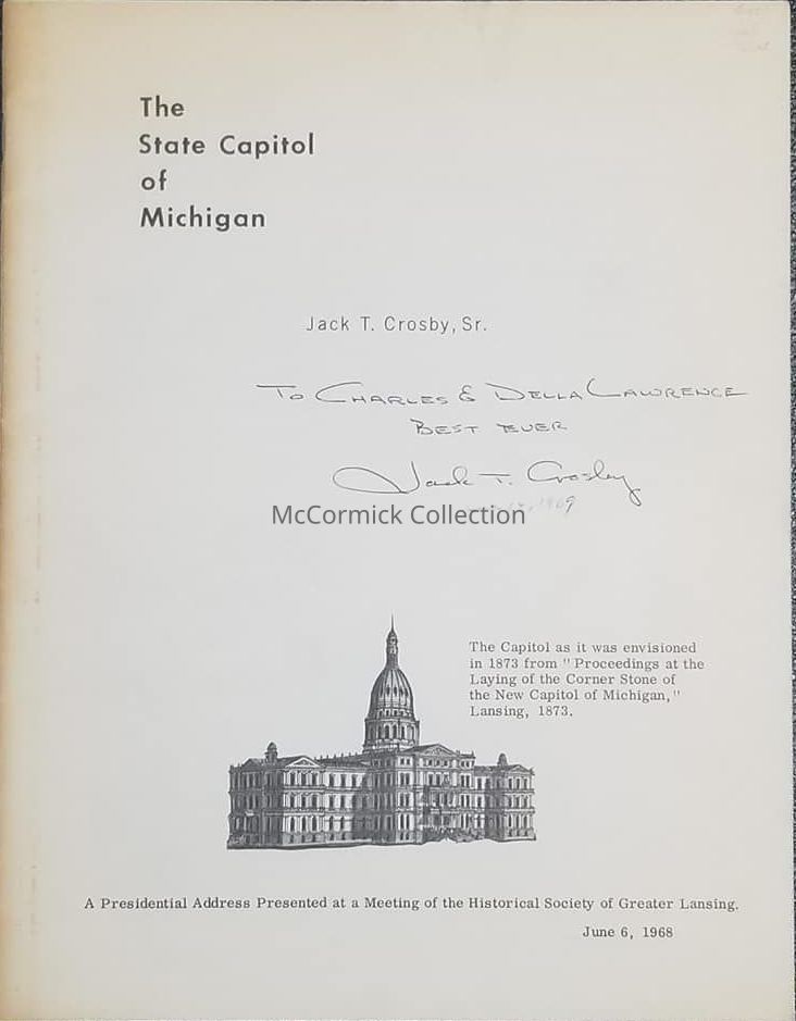 By Jack Crosby for the Historical Society of Greater Lansing. Signed by Crosby.