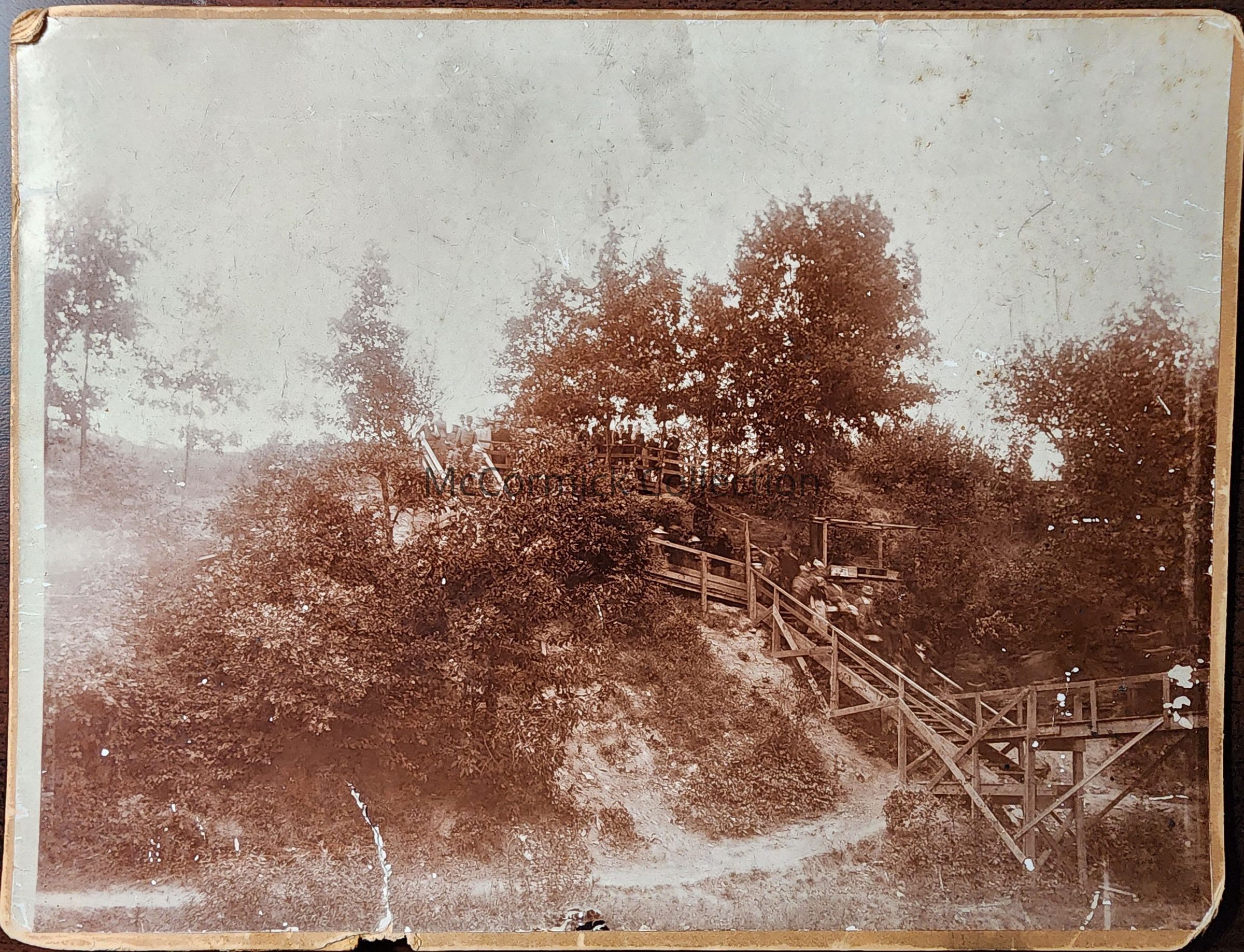 Card mounted photograph of a bridge in Grand Ledge, Michigan, by Grand Ledge photographer F.C. Arms.