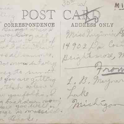 Real photo postcard of the George Scott General Store in Lake, Michigan. Mobiloil advertising sign and gas pump. People gathered in front. Negative number is 20. Postally used, postmark cutoff. Addressed to Brightmore from L.B. Maynard of Lake.