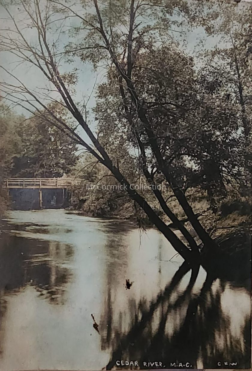 Hand tinted Real photo postcard of the Cedar River at Michigan Agricultural College. Photo by East Lansing photographer Charles E. Walter, C.E.W.