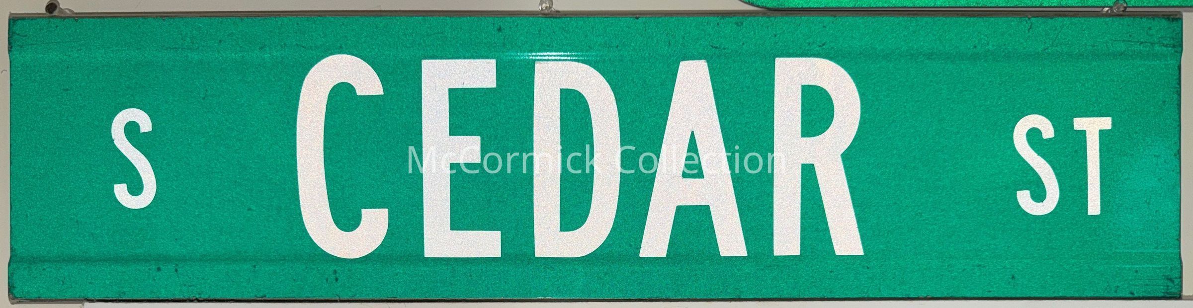 Green metal street sign for South Cedar Street.