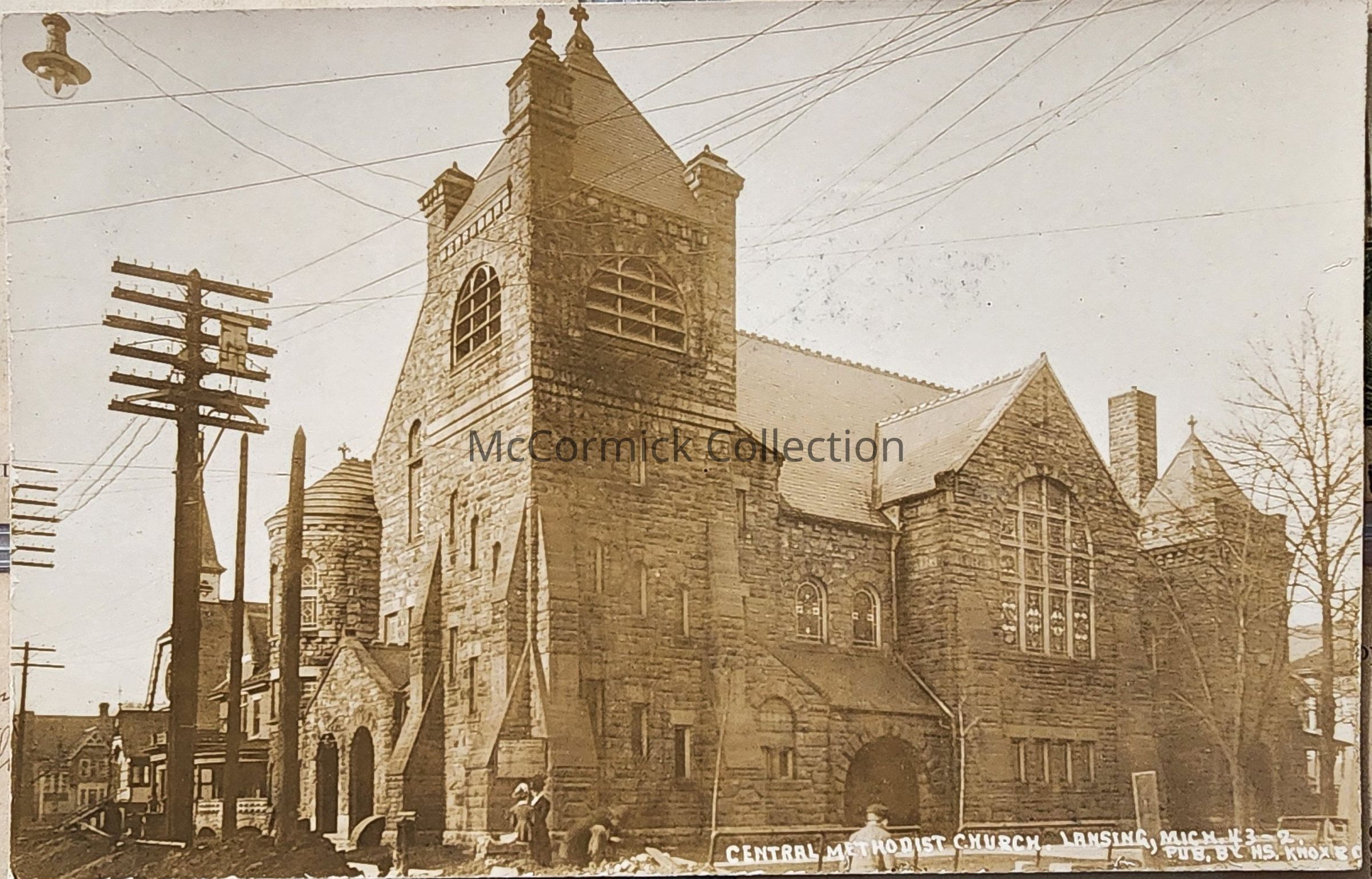 Real photo postcard of Central Methodist Church in Lansing. Postally unused. Published by S.H. Knox & Co., Lansing.