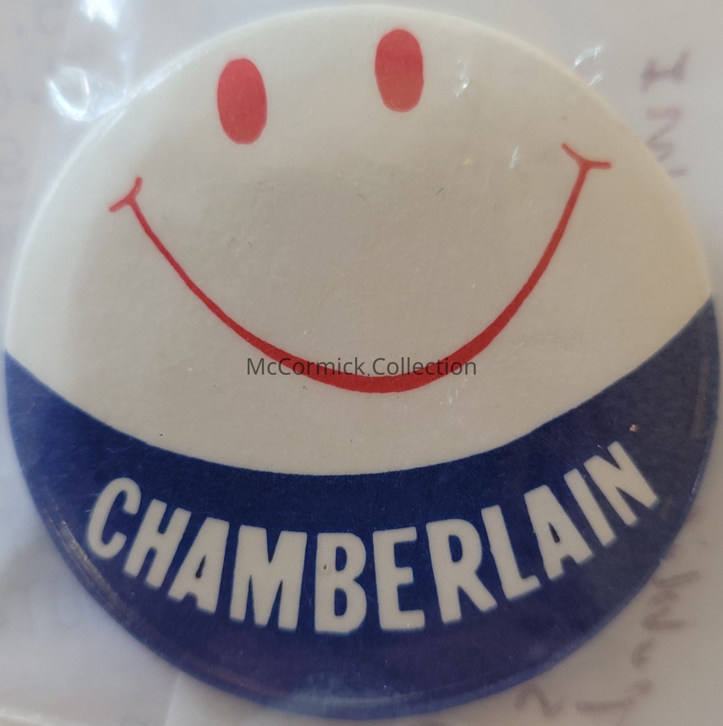 A 1.5" red, white, and blue smiley face political button for Charles E. Chamberlain for Congress, circa 1960s.