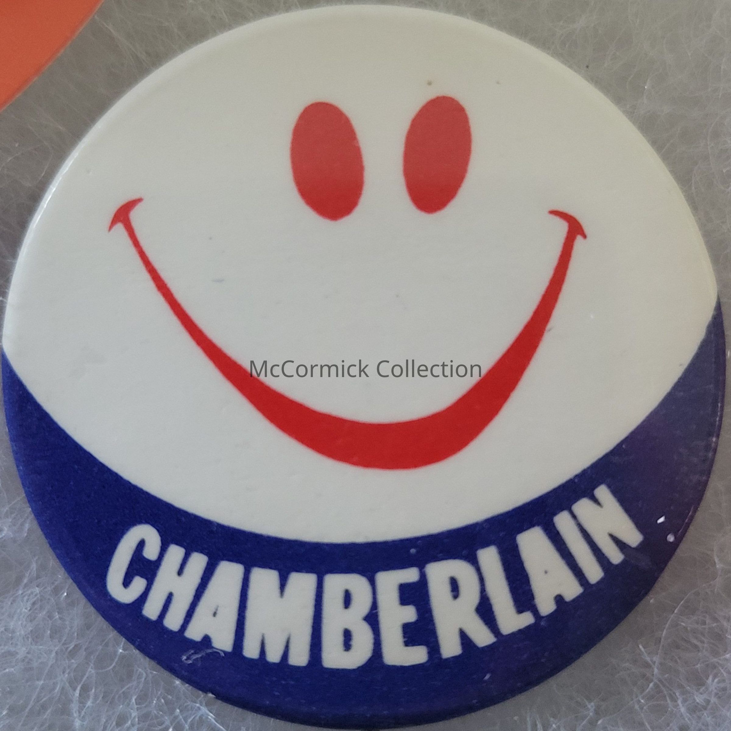 A 1.25" red, white, and blue political smiley face button for Charles Chamberlain for U.S. Congress, circa 1960s-70s.