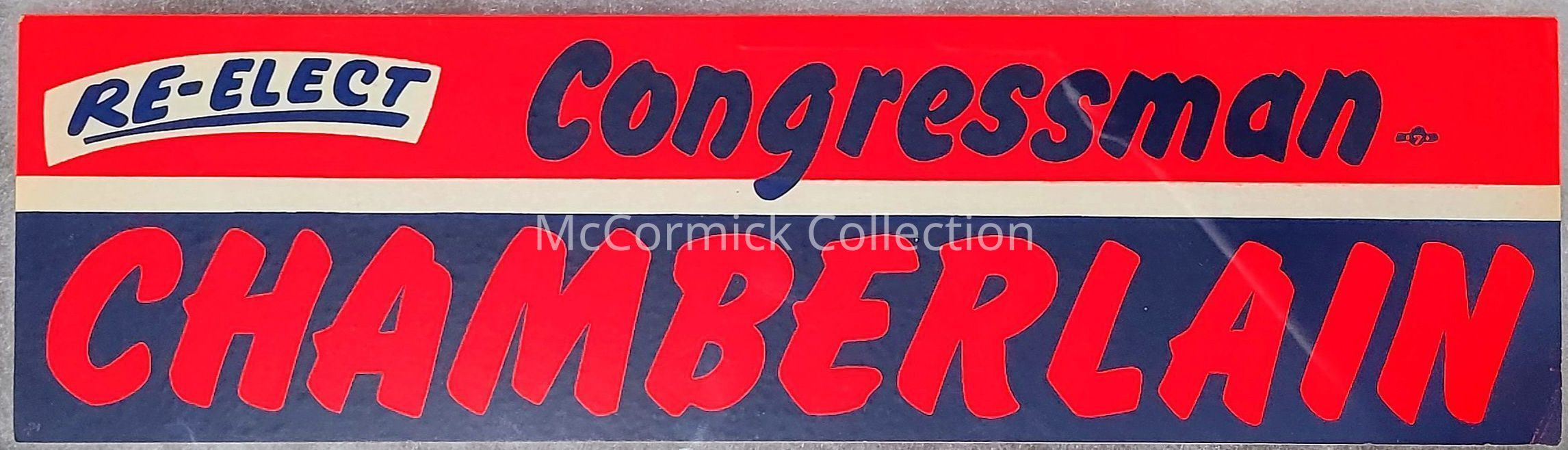 Political campaign bumper sticker for the Reelection of Charles Chamberlain to Congress. He represented the Lansing area.
