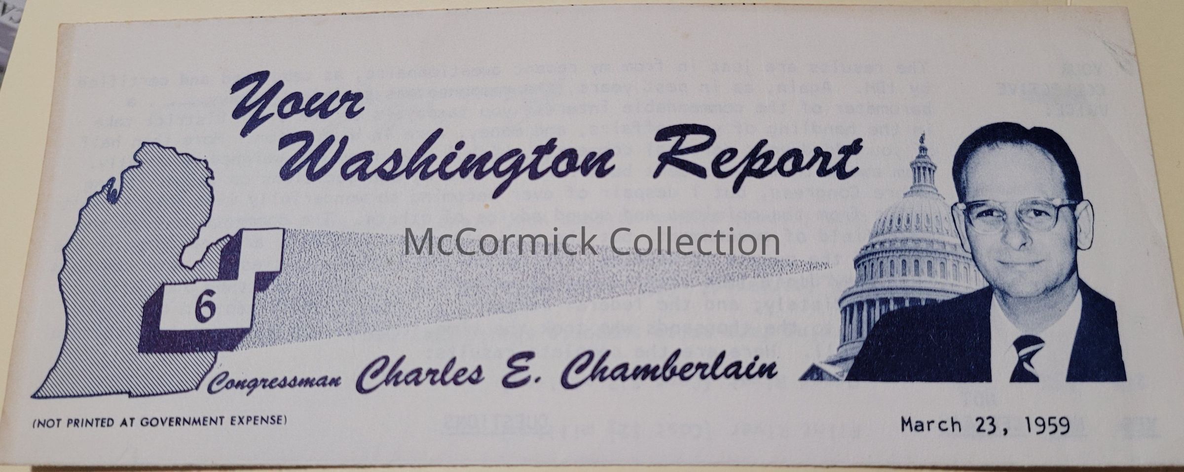 Political paper pamphlet, "Your Washington Report" from Congressman Charles Chamberlain, 1959.