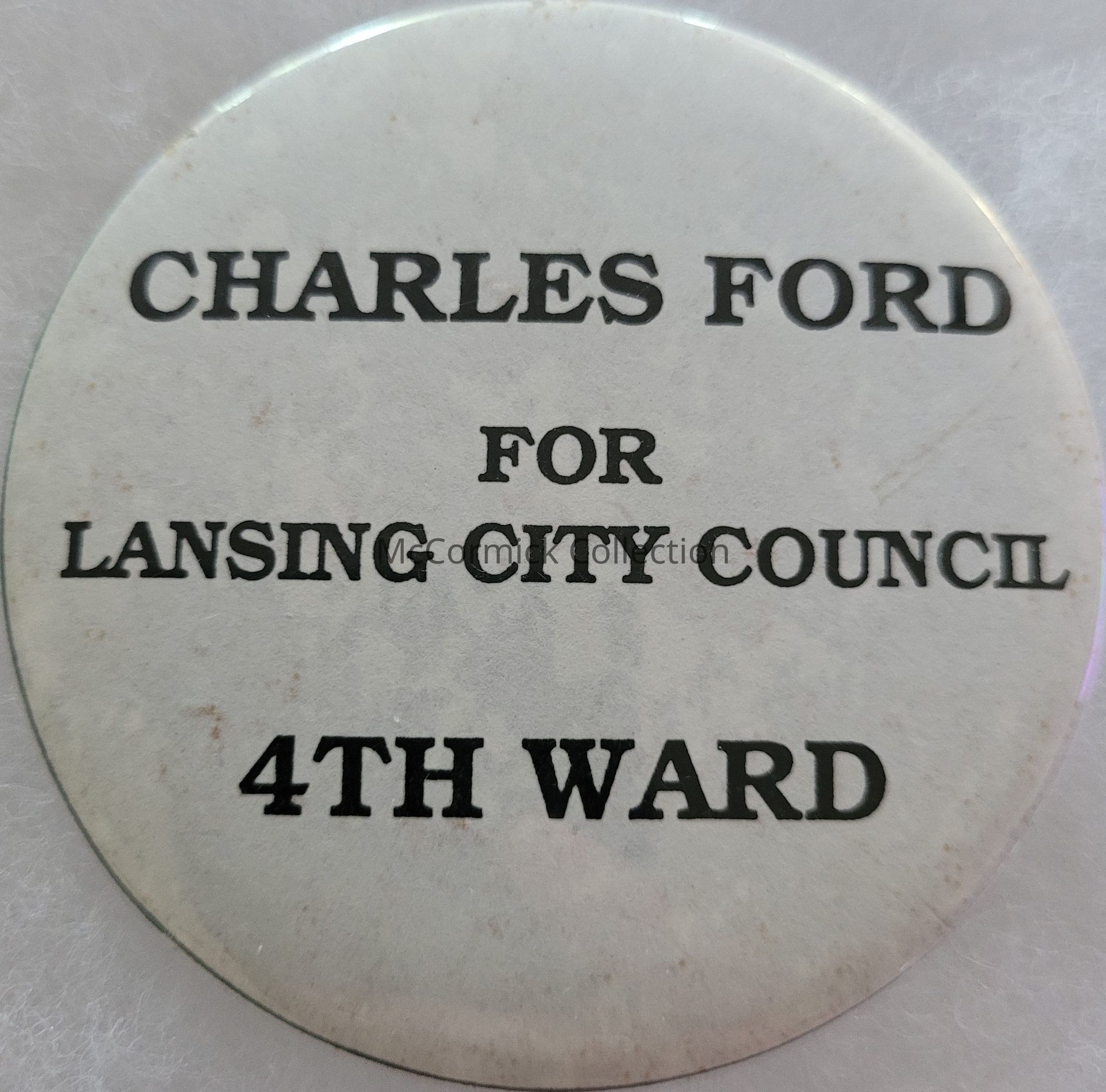 A black and white political button for Charles Ford for Lansing City Council 4th Ward. Kingdon Collection.