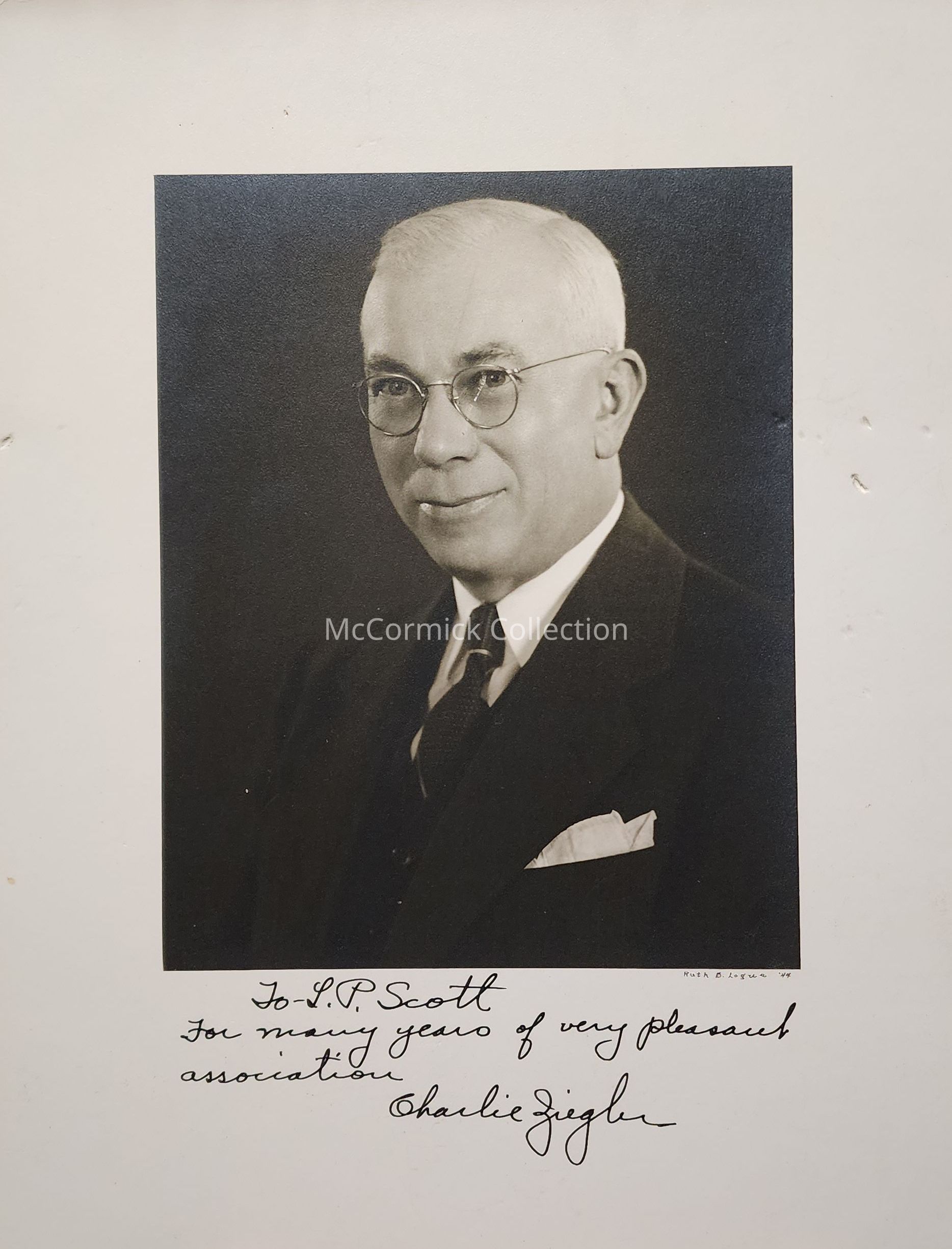 Inscribed Photograph of Michigan State Highway Commissioner Charles Ziegler to L.P. Scott. Photo by Ruth B. Logue, 1944.