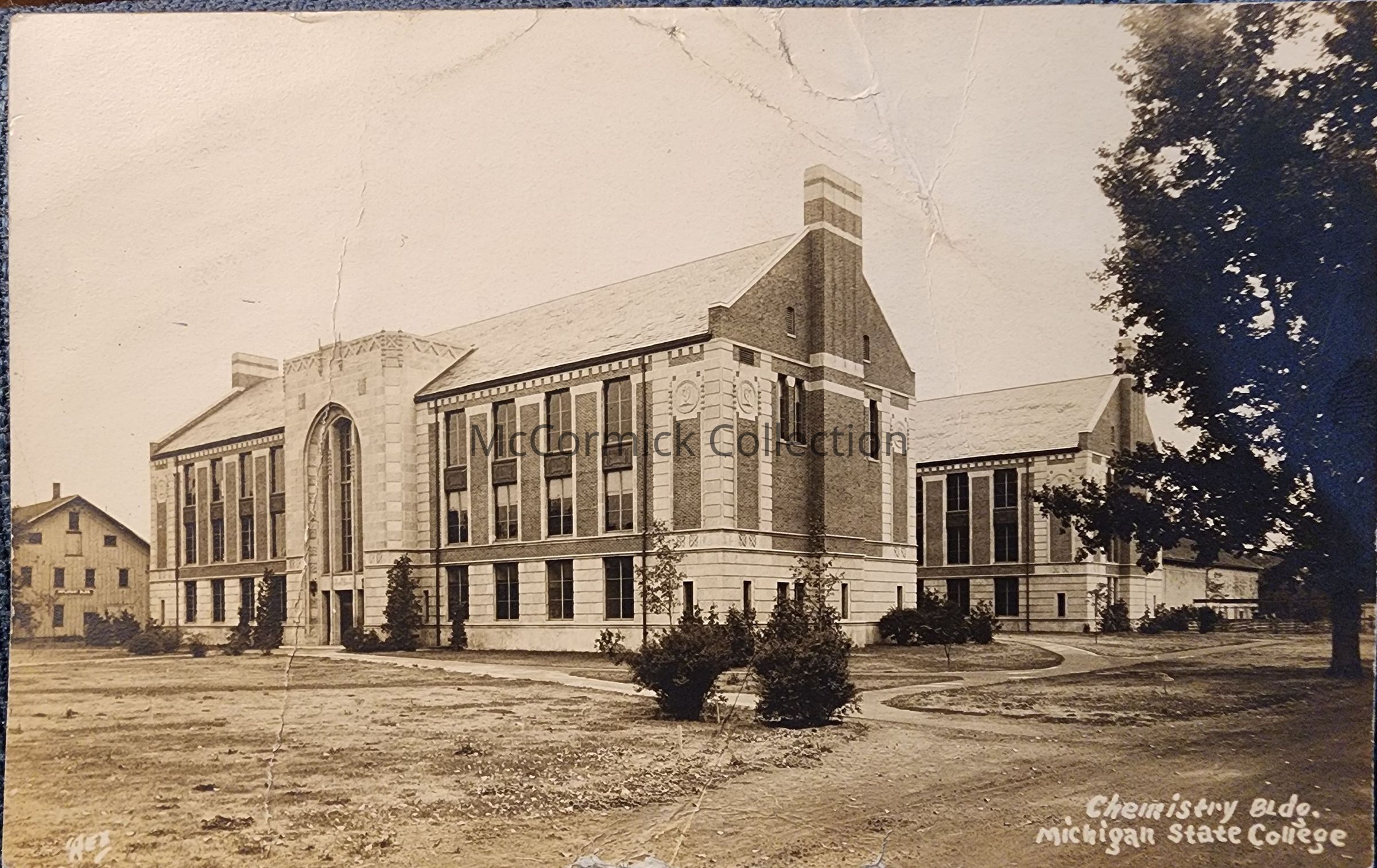 Real photo postcard of the new Chemistry Building, Kedzie Hall, at Michigan State College. Postally unused. By East Lansing photographer Rex.