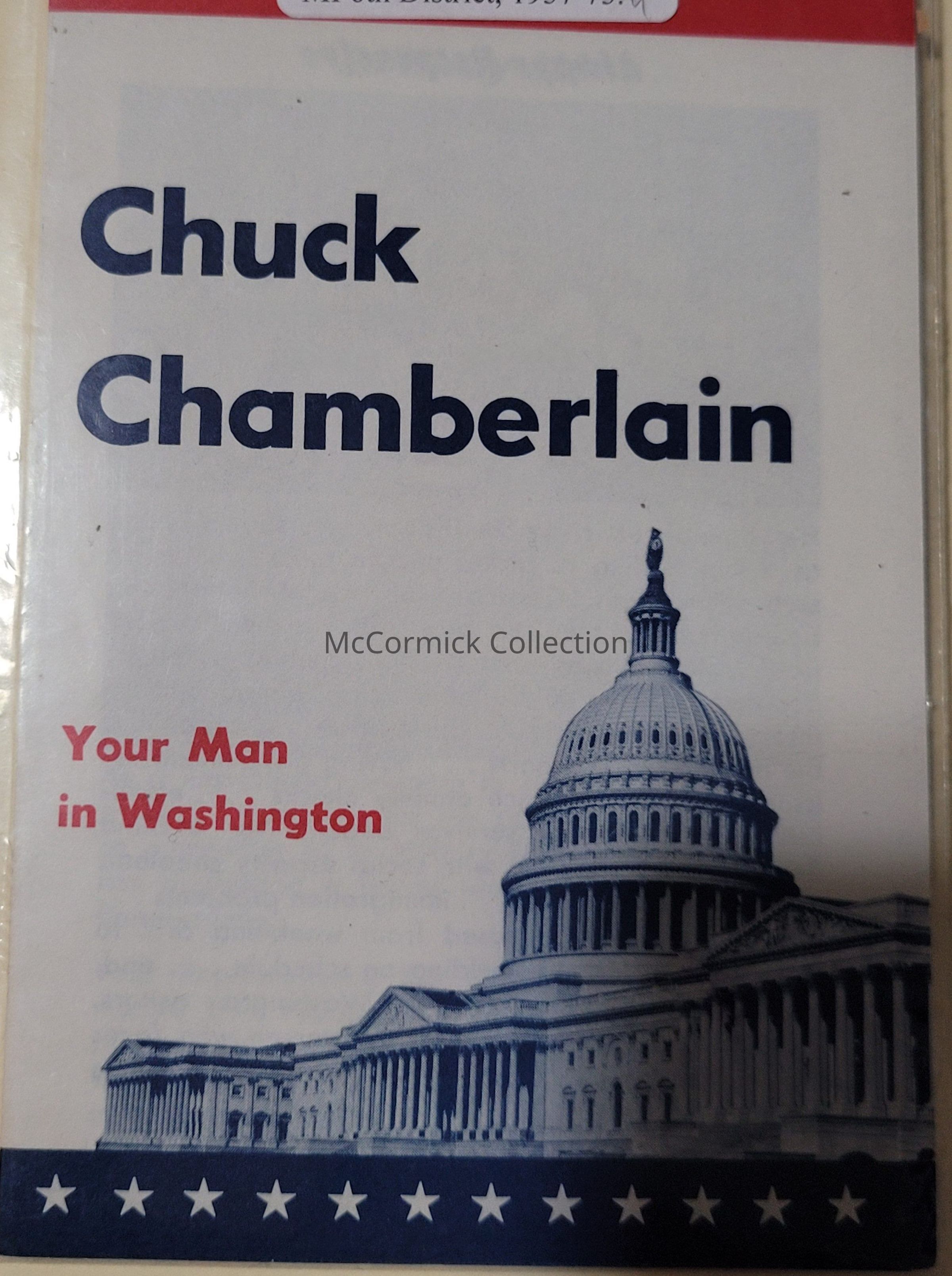 A red, white, and blue pamphlet for Chuck Chamberlain for Congress.