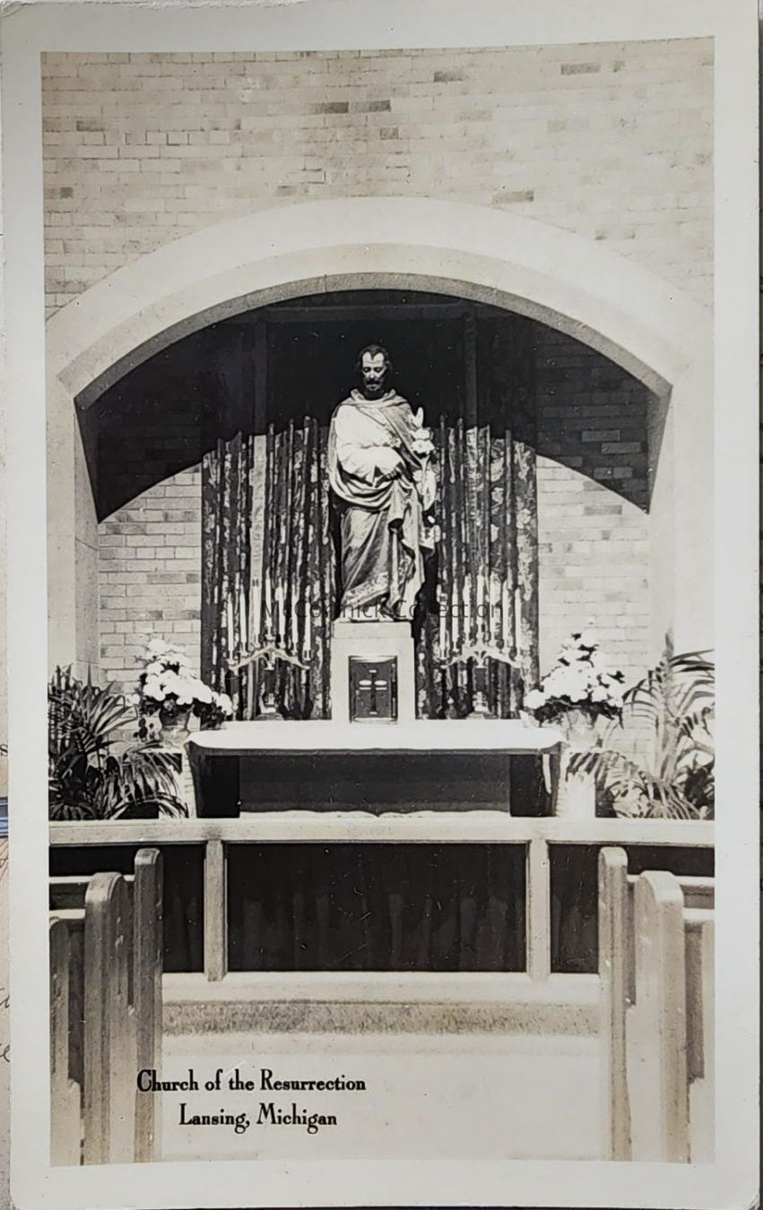 Real photo postcard of the interior of the Church of the Resurrection in Lansing. By Linn Camera Shop. Postally unused.