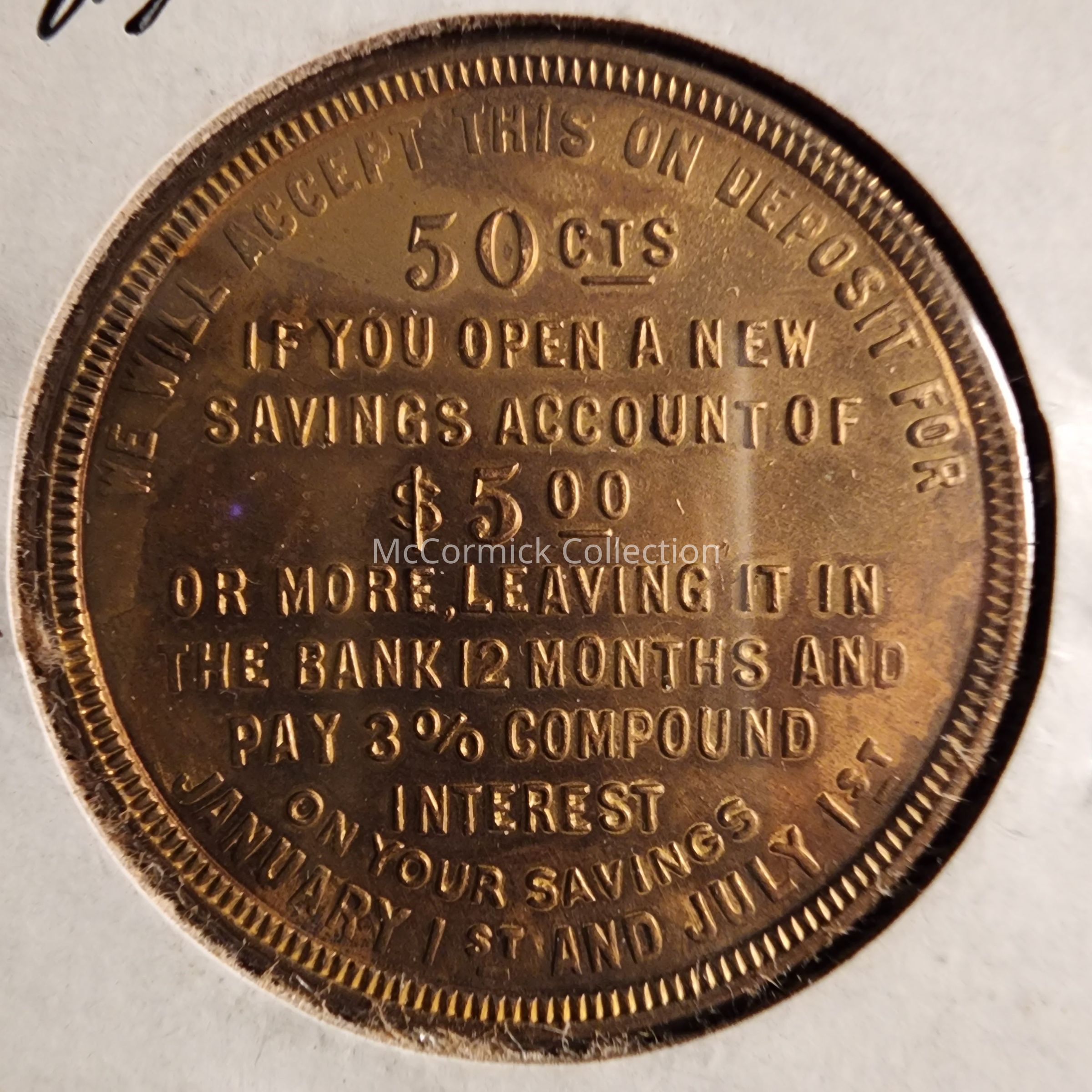 City National Bank, Lansing, Michigan Token for 50 cents in a new bank account with 5 dollars.