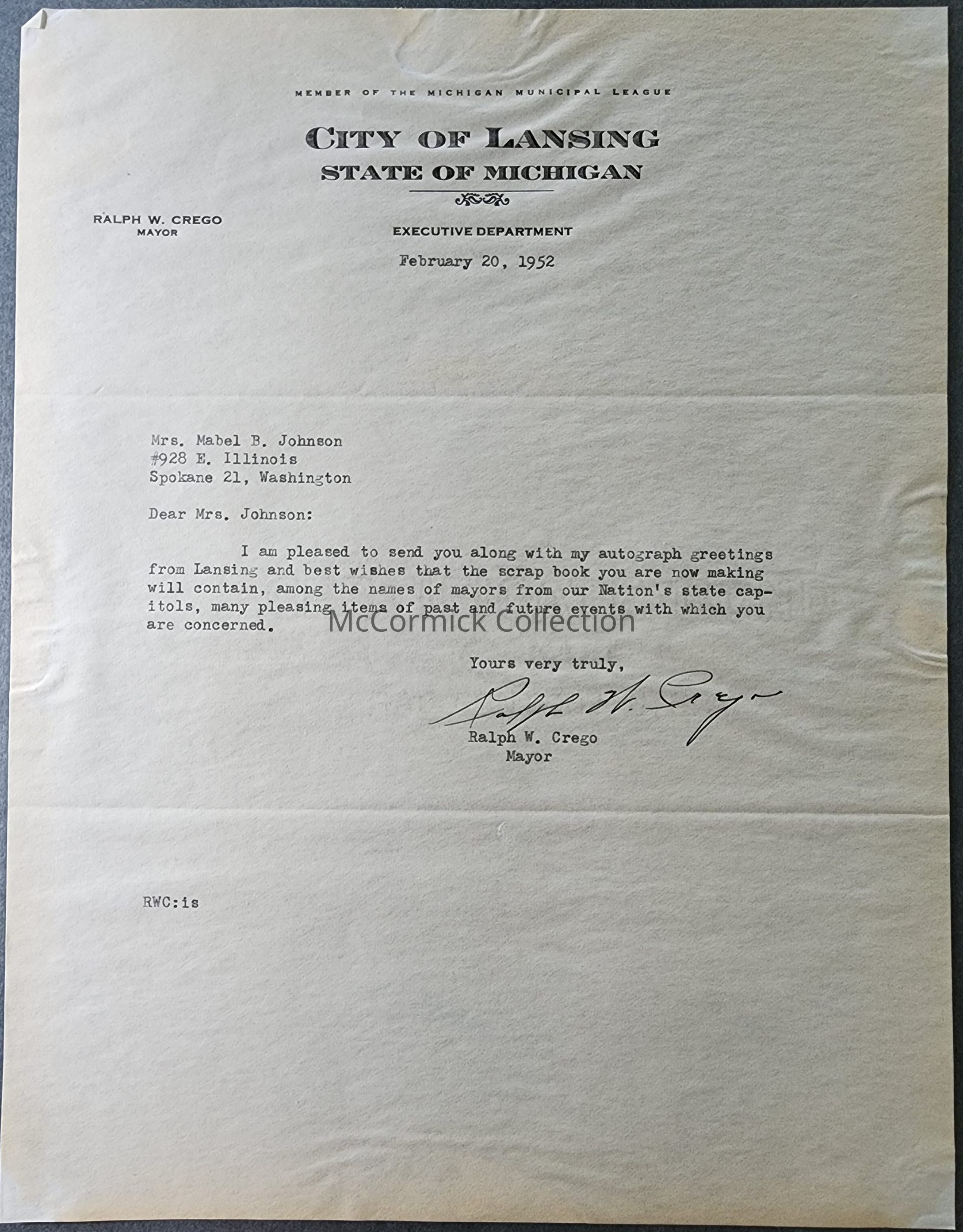 A signed letter on City of Lansing stationery/letterhead from 1952. Signature of Mayor Ralph W. Crego.