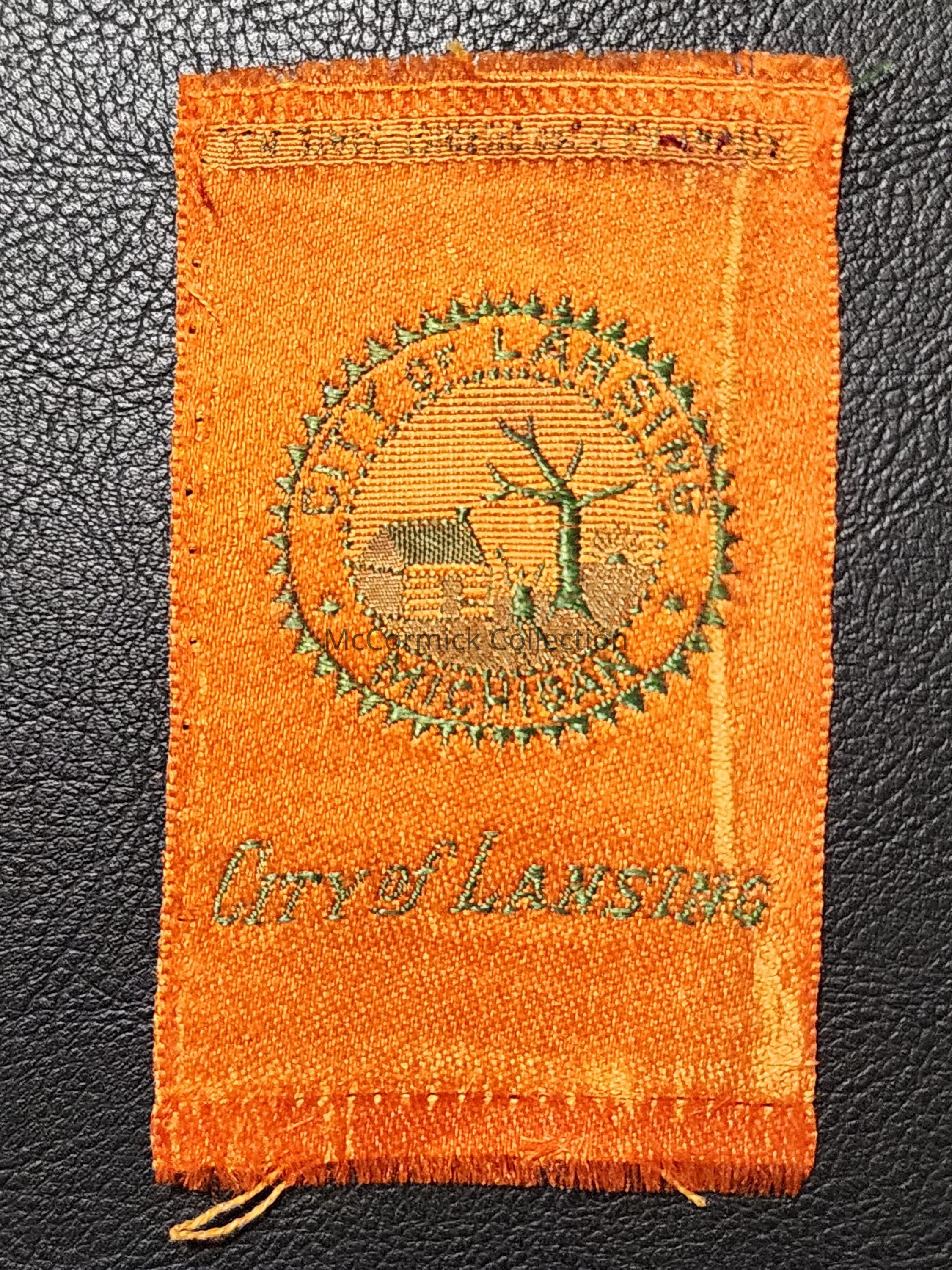 Orange silk with City of Lansing log cabin seal. Vintage tobacco silk.