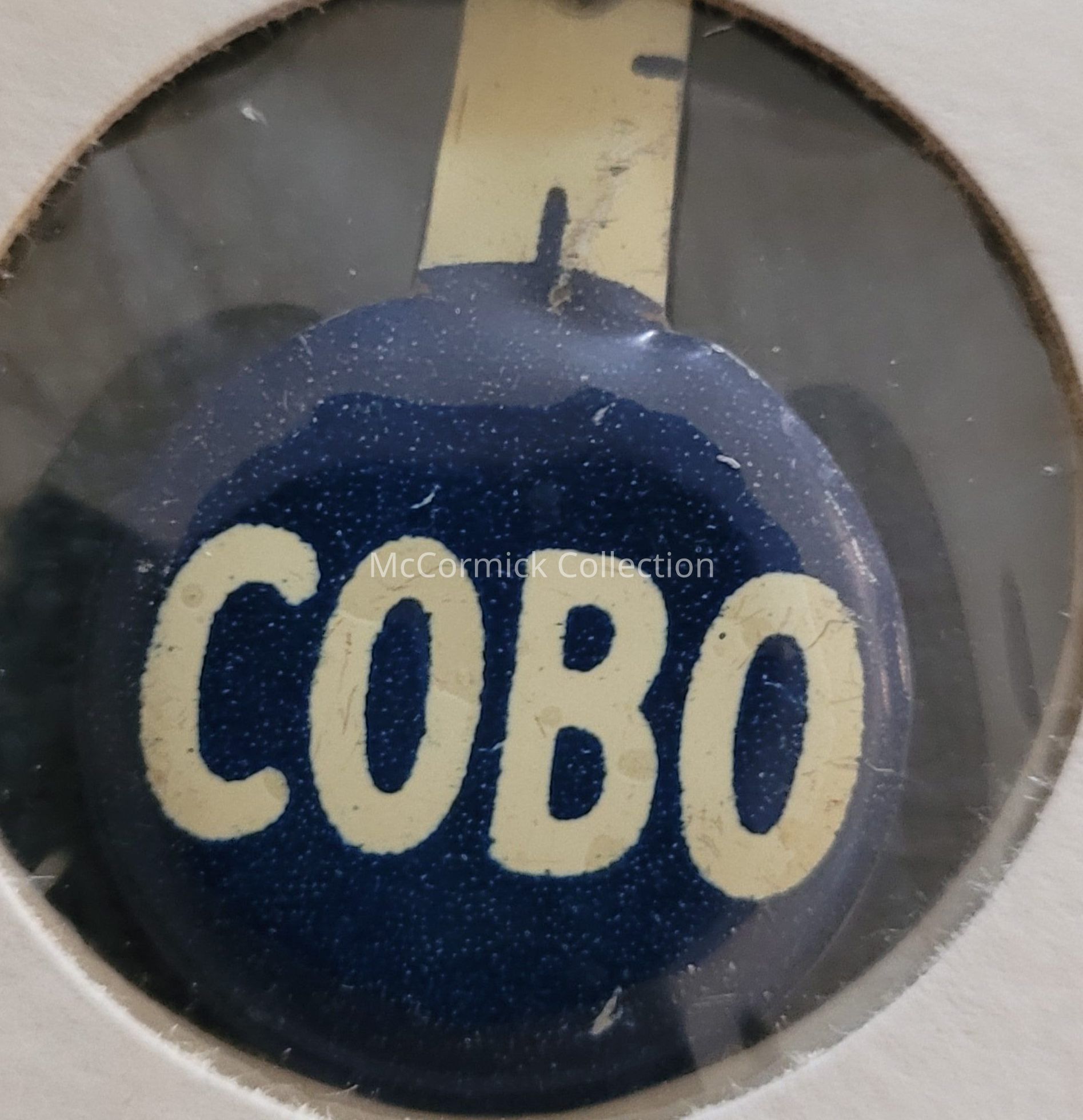 Blue and white political tab for the 1956 gubernatorial campaign of Albert Cobo, Mayor of Detroit.