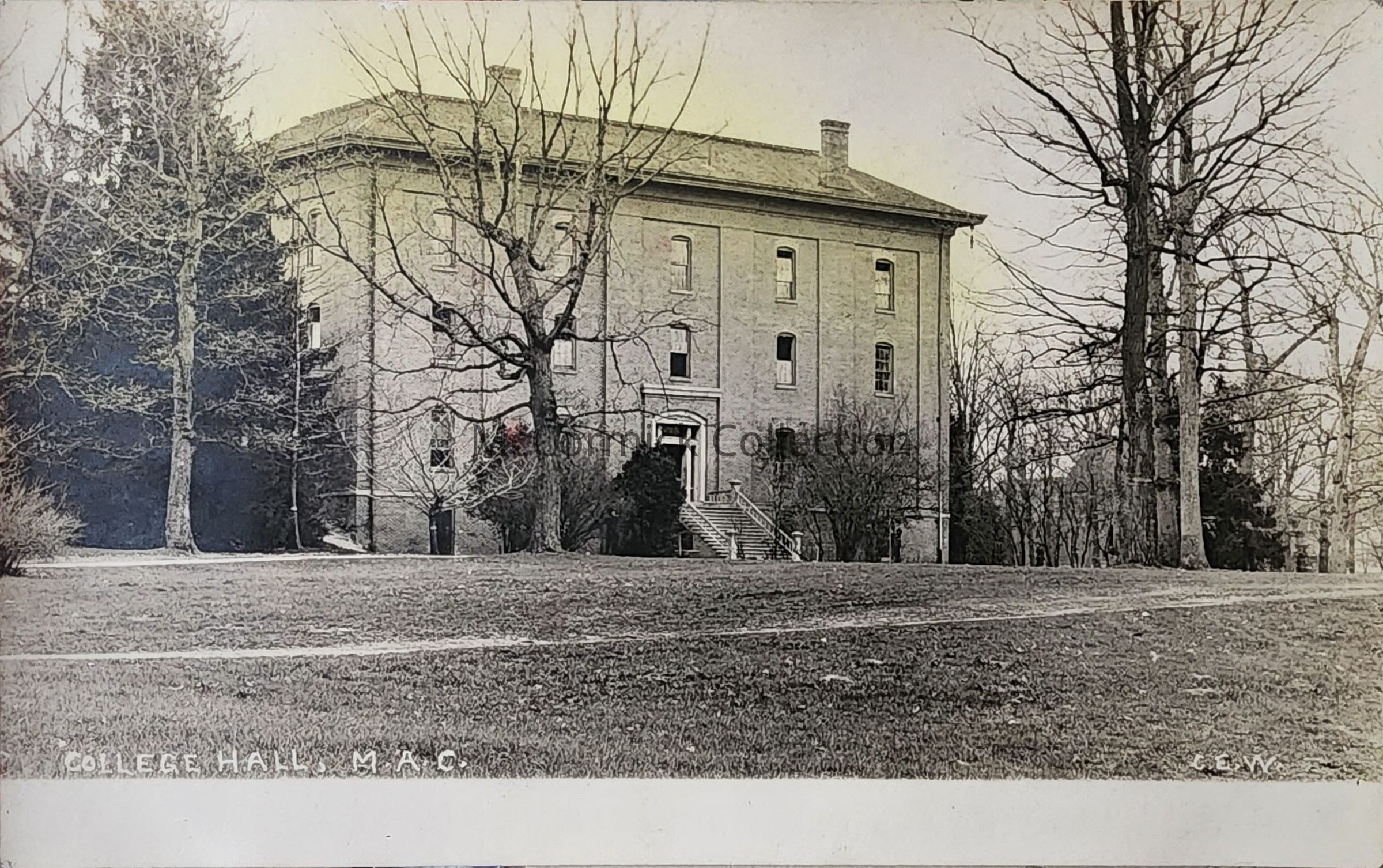 Real photo postcard of College Hall at Michigan Agricultural College. Photo by East Lansing photographer Charles E. Walter, C.E.W.