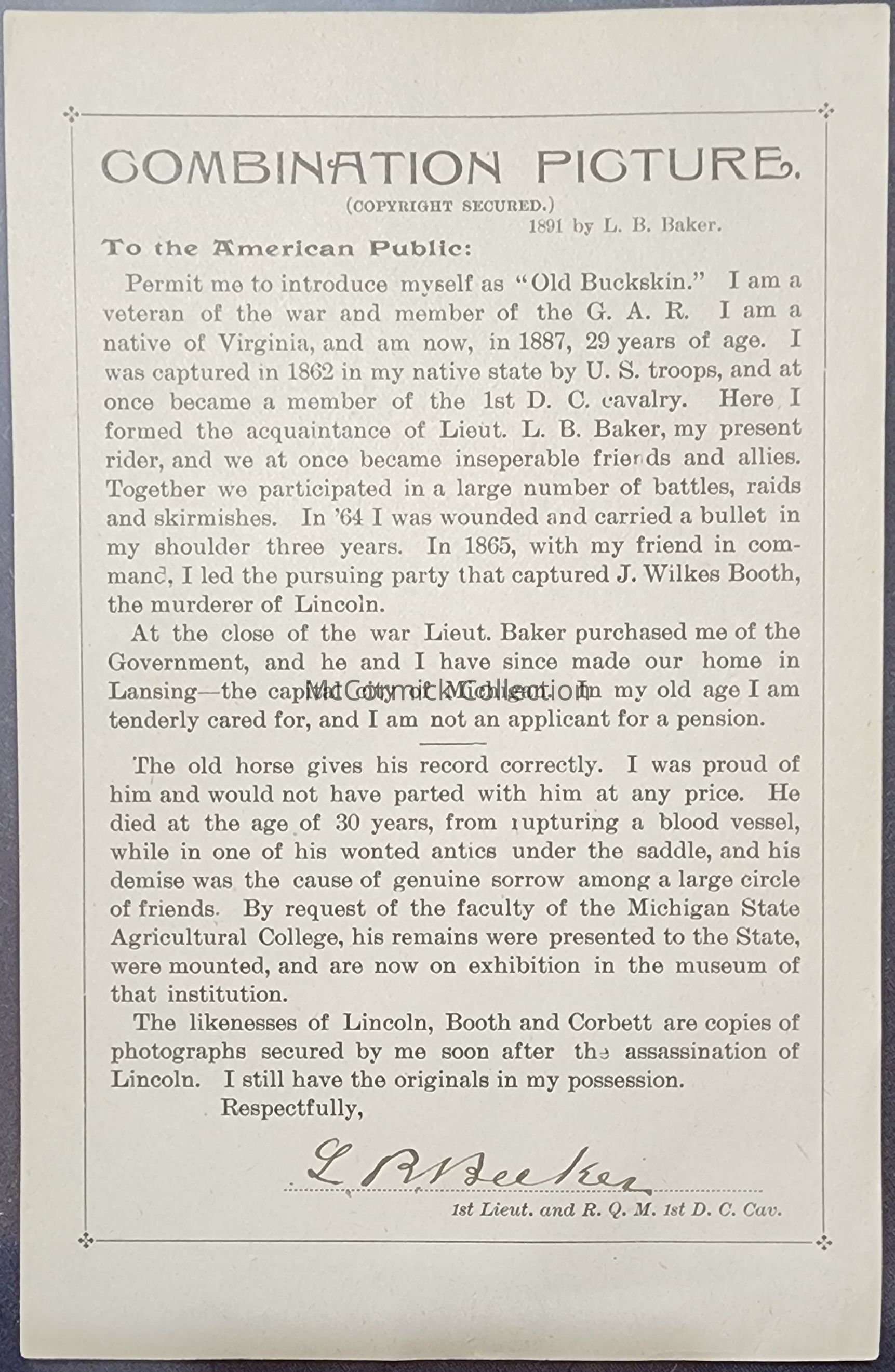 Flier written from the perspective of Buckskin, the beloved horse of Lt. Luther Byron Baker, telling of their history and capture of John Wilkes Booth. The flier also discusses the composite photographs Baker had produced and sold as souvenirs. Signed by L.B. Baker, 1891.