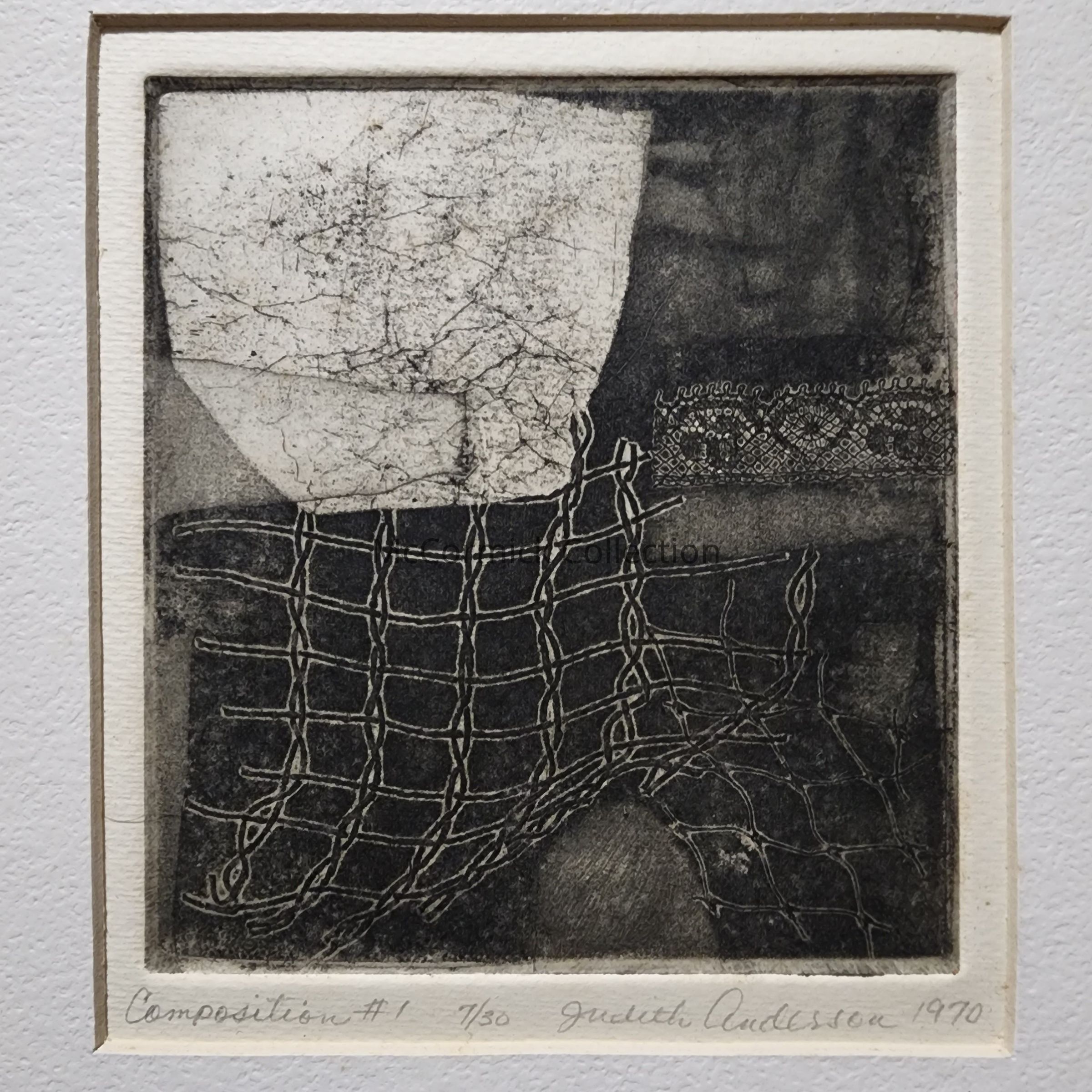 Signed and numbered edition print, 7/30, titled "Composition #1" by East Lansing artist Judith Anderson, dated 1970.