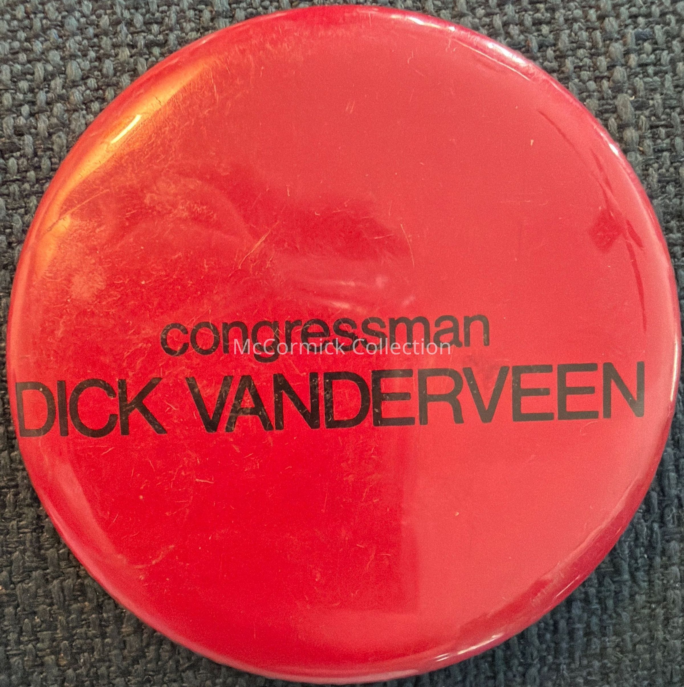 A 2.25” red and black political button for Dick Vanderveen for Congress.