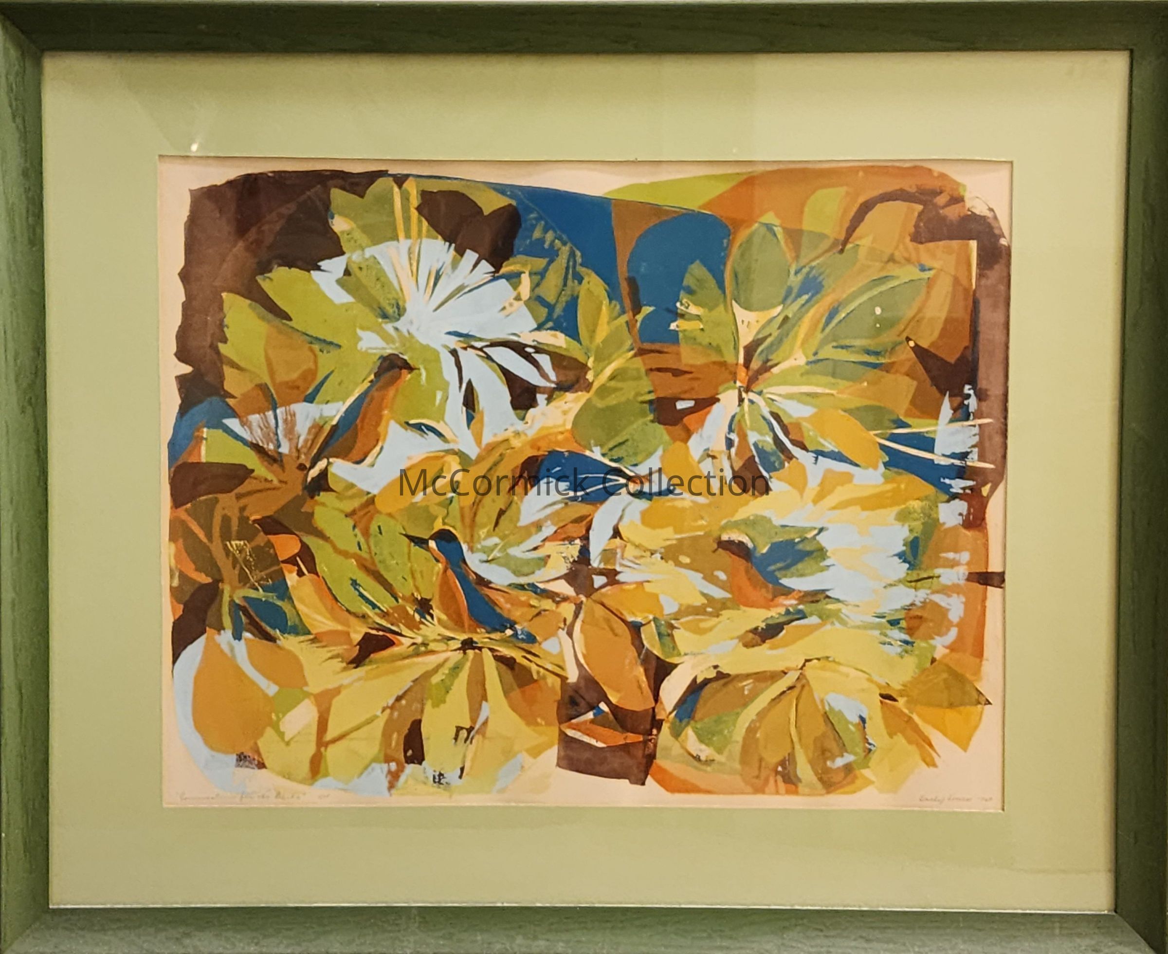 "Conversations for the Birds" serigraph or silkscreen by Lansing artist Sally Swiss. She was an art teacher in Lansing Schools before becoming a working artist full time.