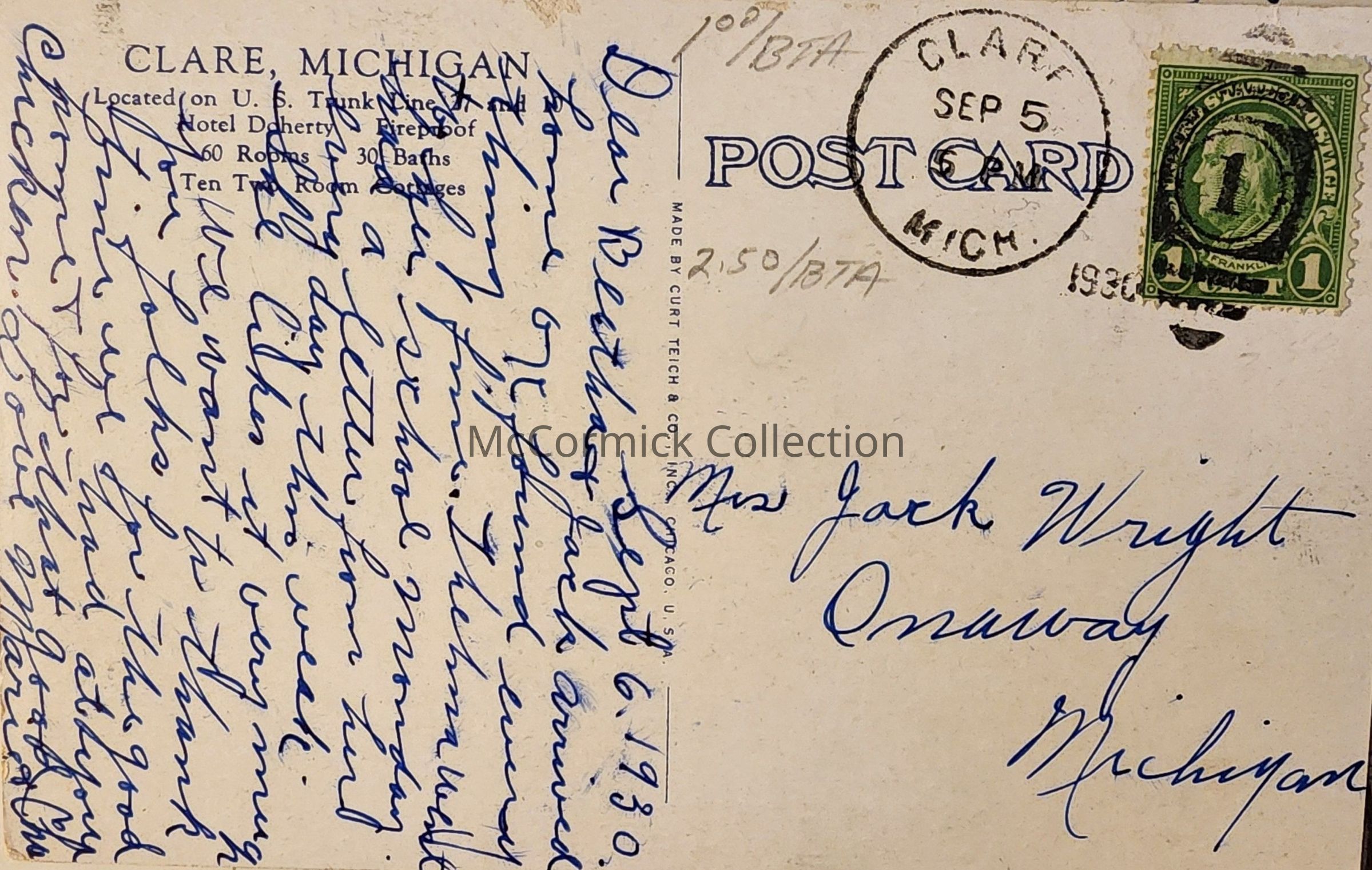 Cottage Annex, Hotel Doherty, Clare, Mich., Postcard