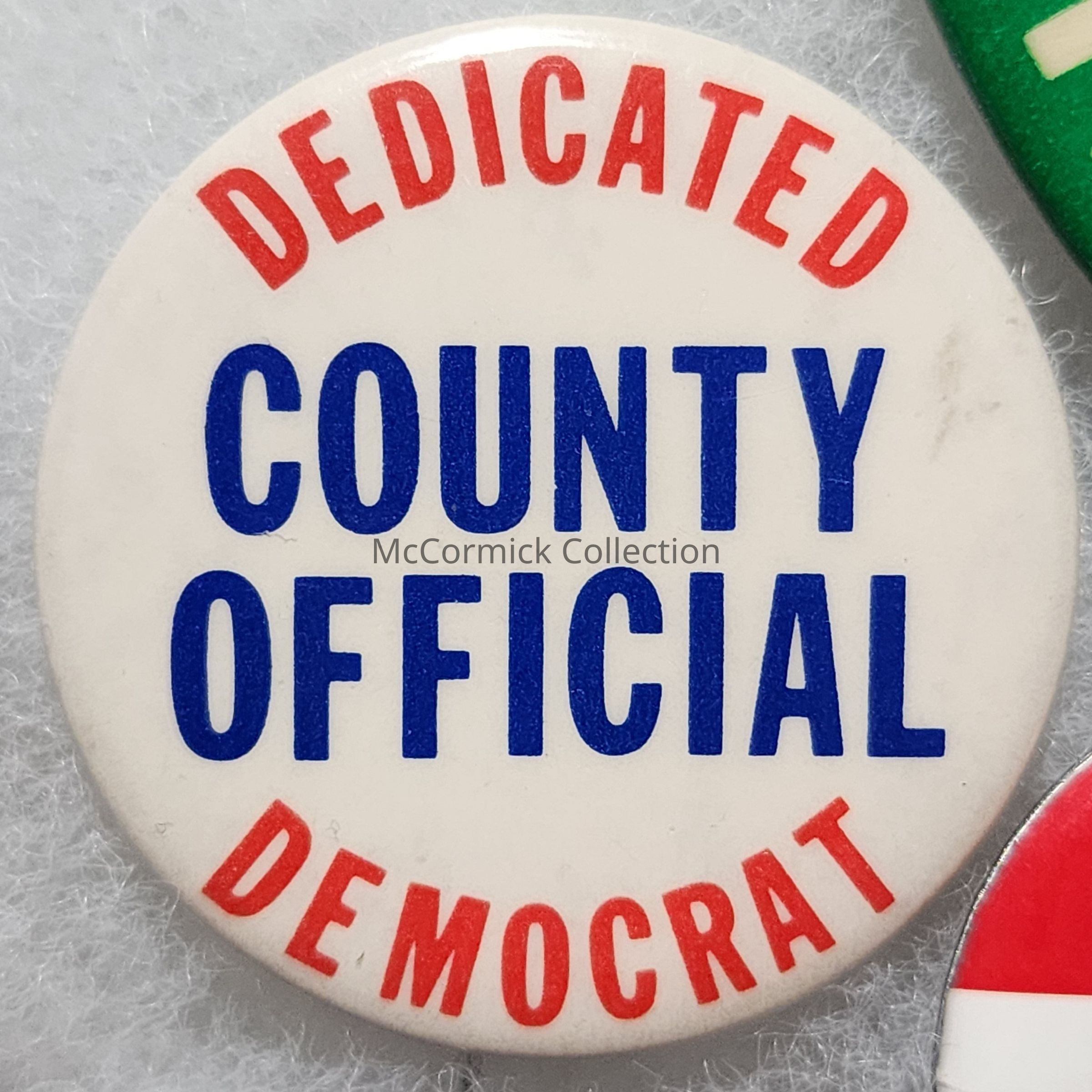 A 1.5" red, white, and blue button for a Dedicated Democrat County Official. Came from an Ingham County estate.