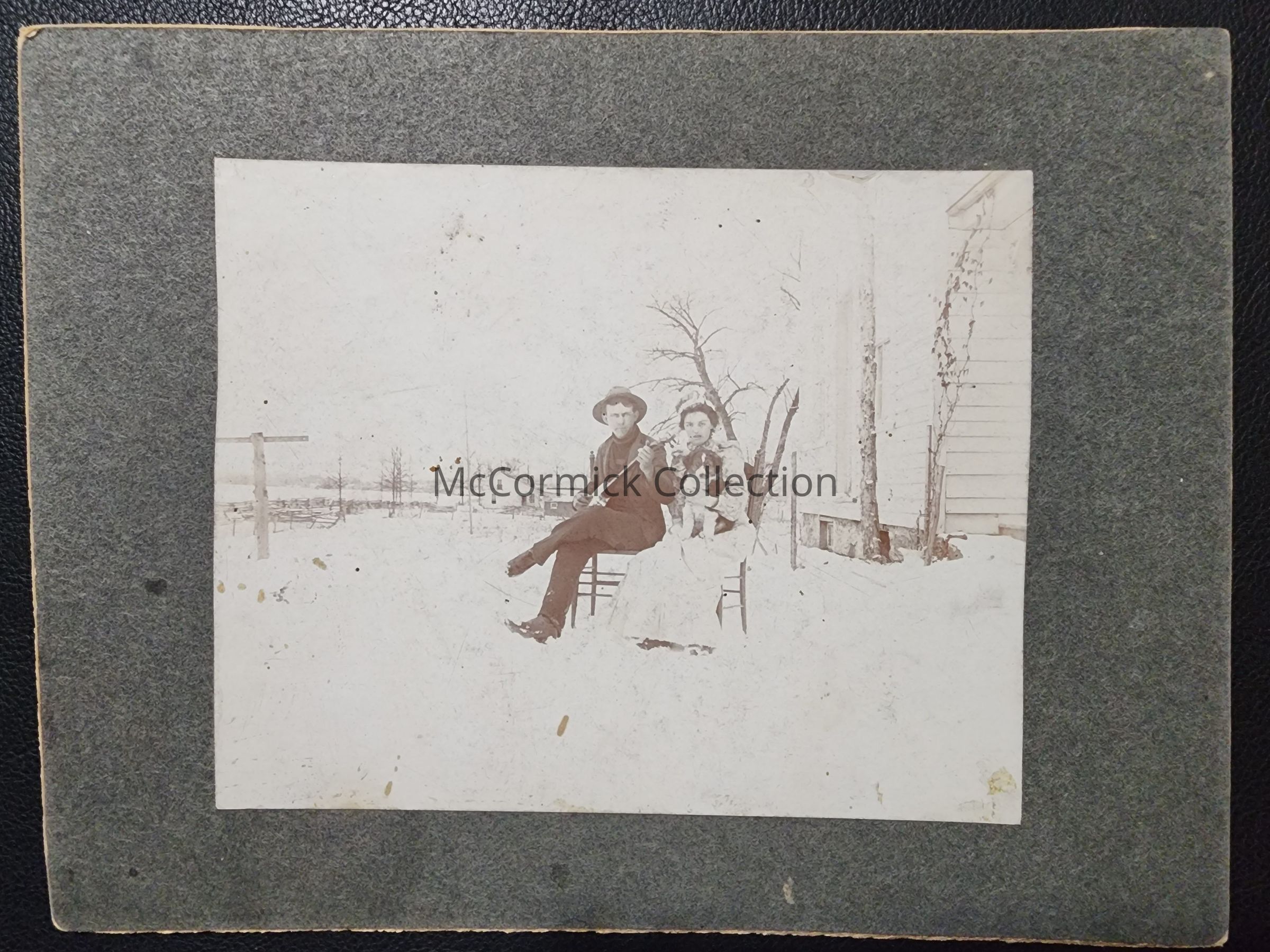 Card mounted photograph of a couple seated outside of a house in the winter with snow on the ground. The man holds a violin and the woman holds a dog. A road and house are in the distance. Believed to be from Lansing, no photographer. From the Weymouth Collection.