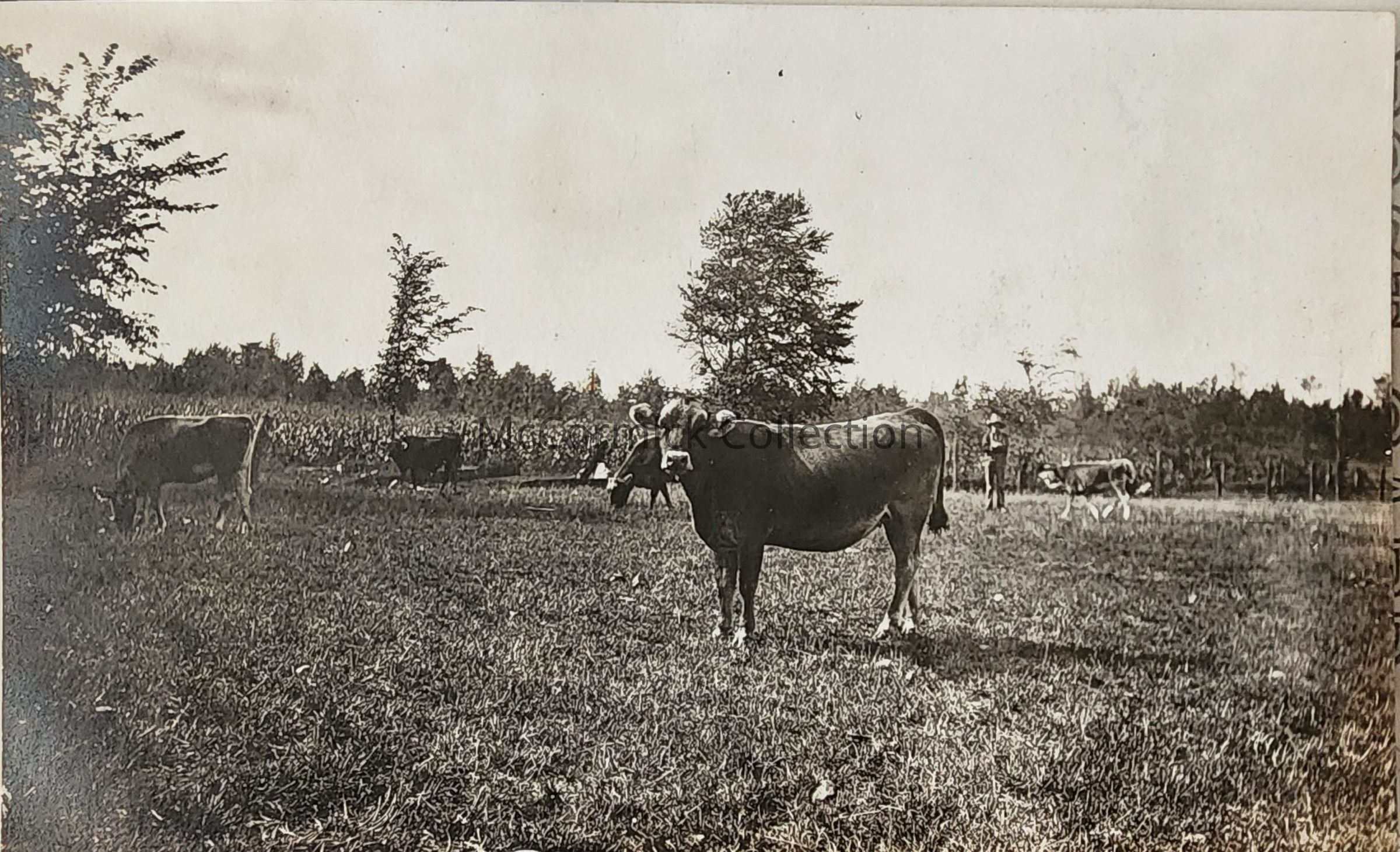 Real photo postcard of cows on a farm field by Lansing photographer Bovee.