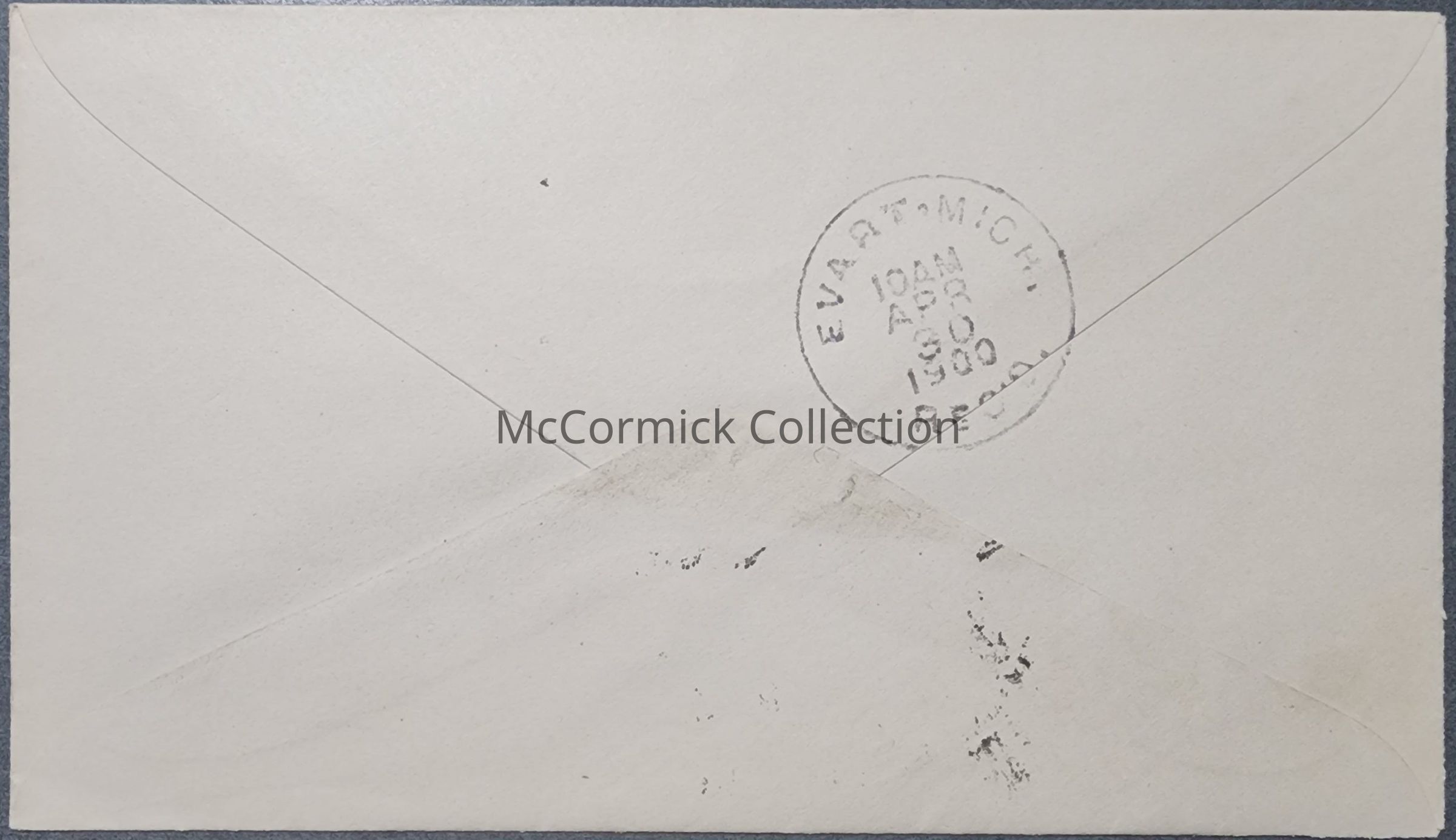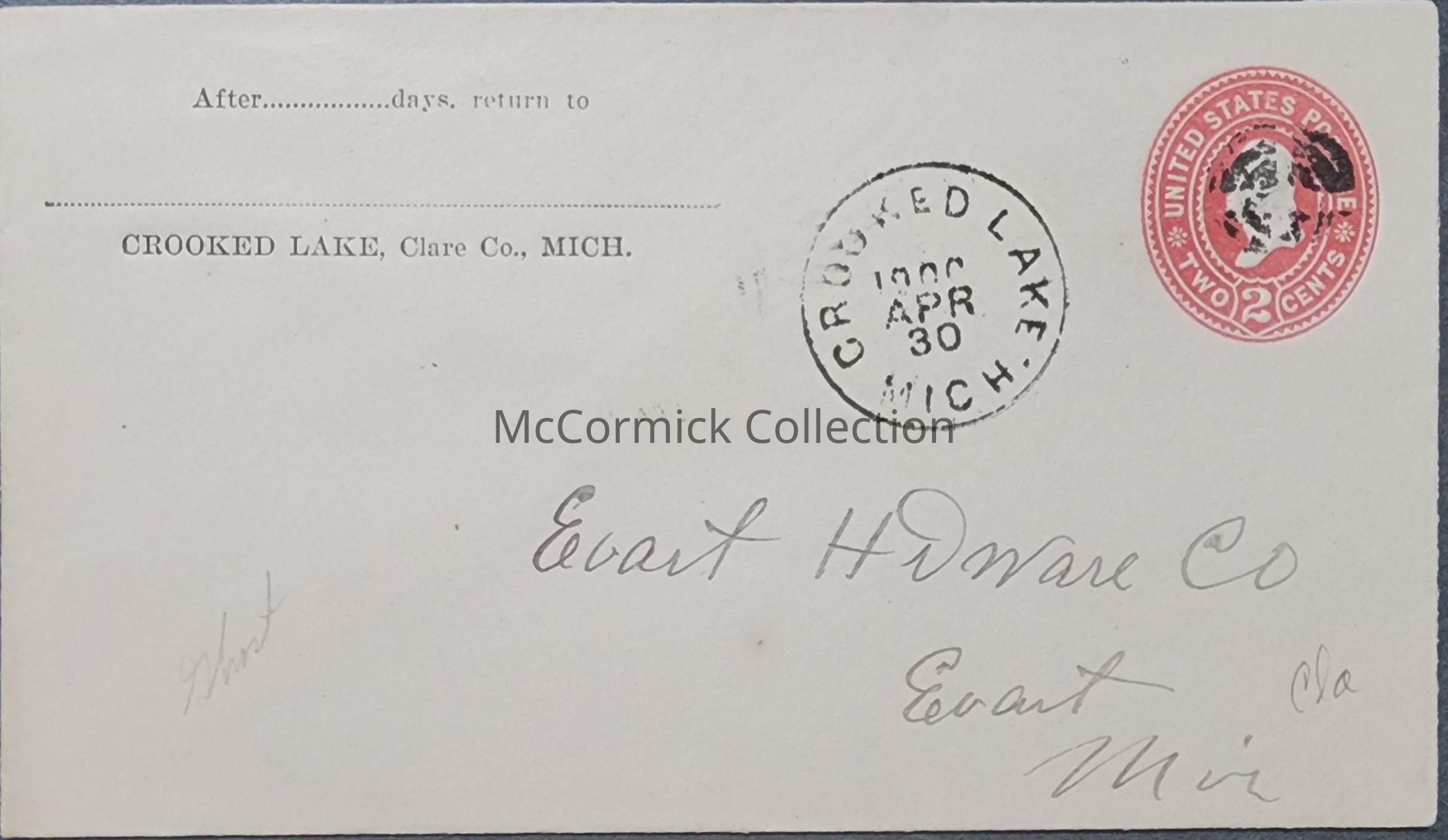 1900 Crooked Lake postmark on postoffice envelope. Addressed to Evart Hardware. Also has an Evart postmark on the back.
