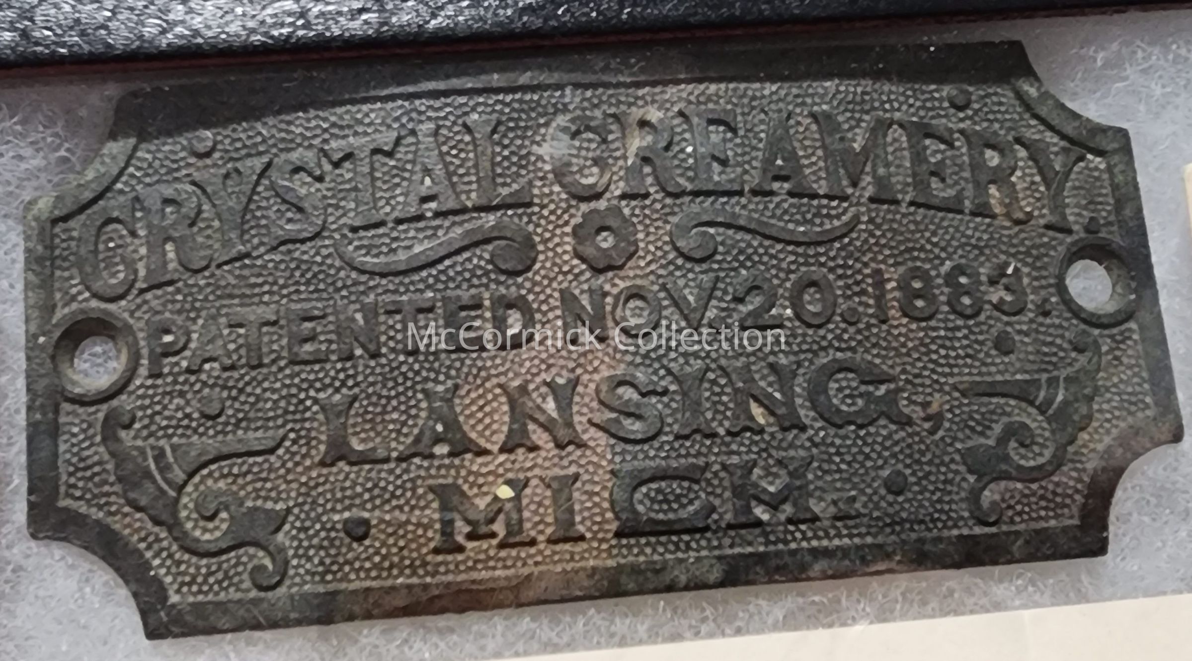 A metal plaque from a bottle or can from the Crystal Creamery of Lansing, reads "Patented Nov. 20, 1883."
