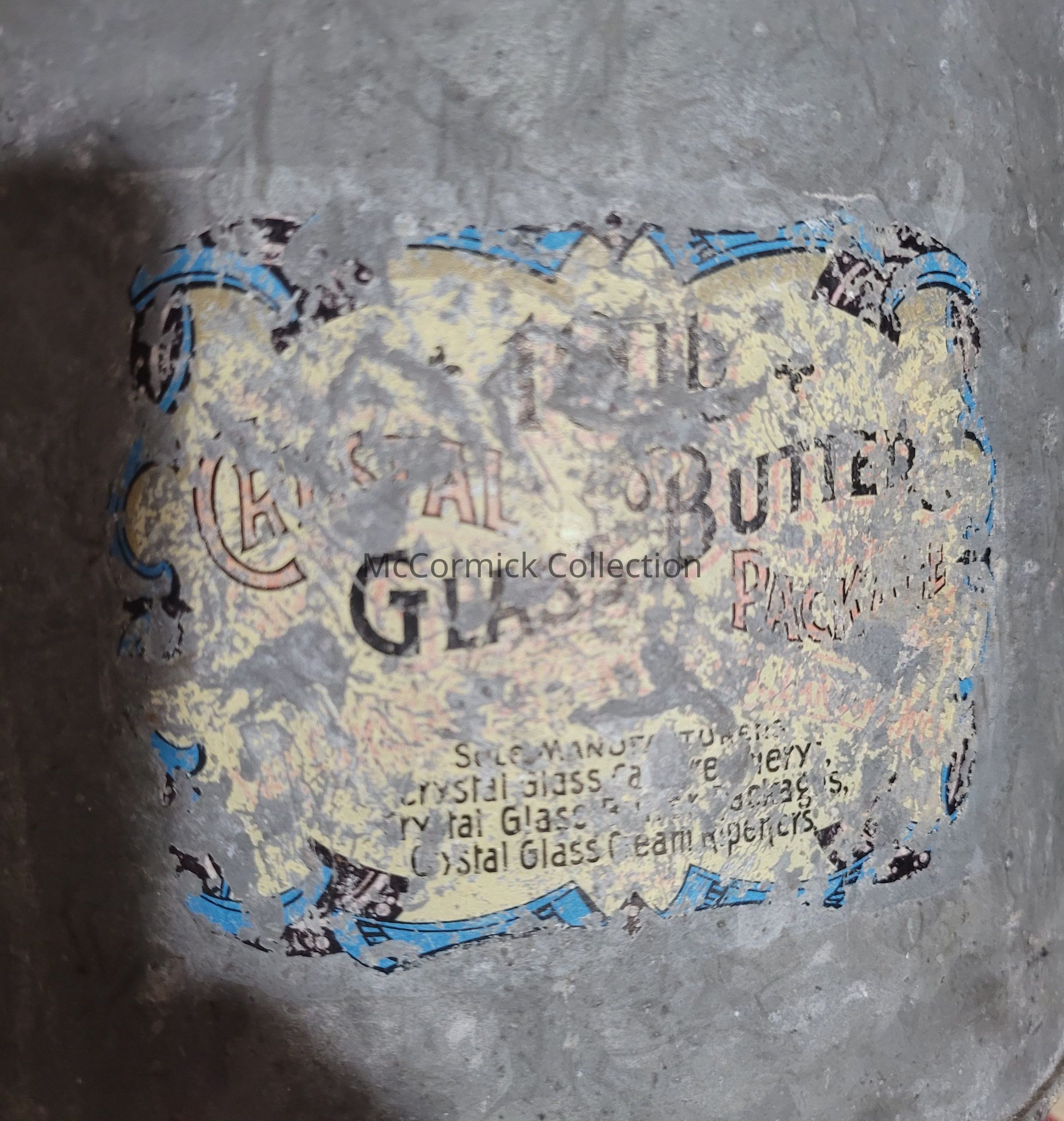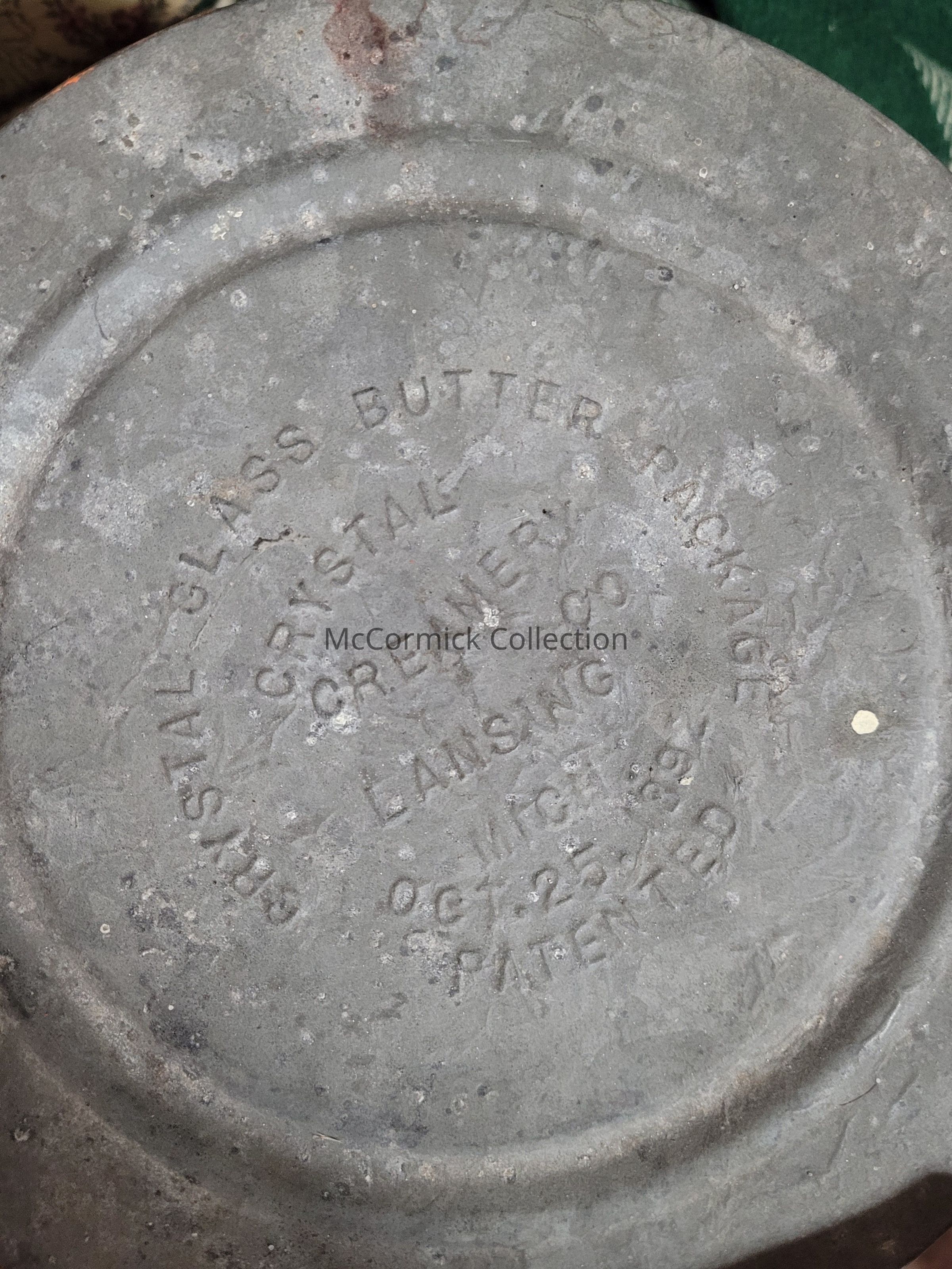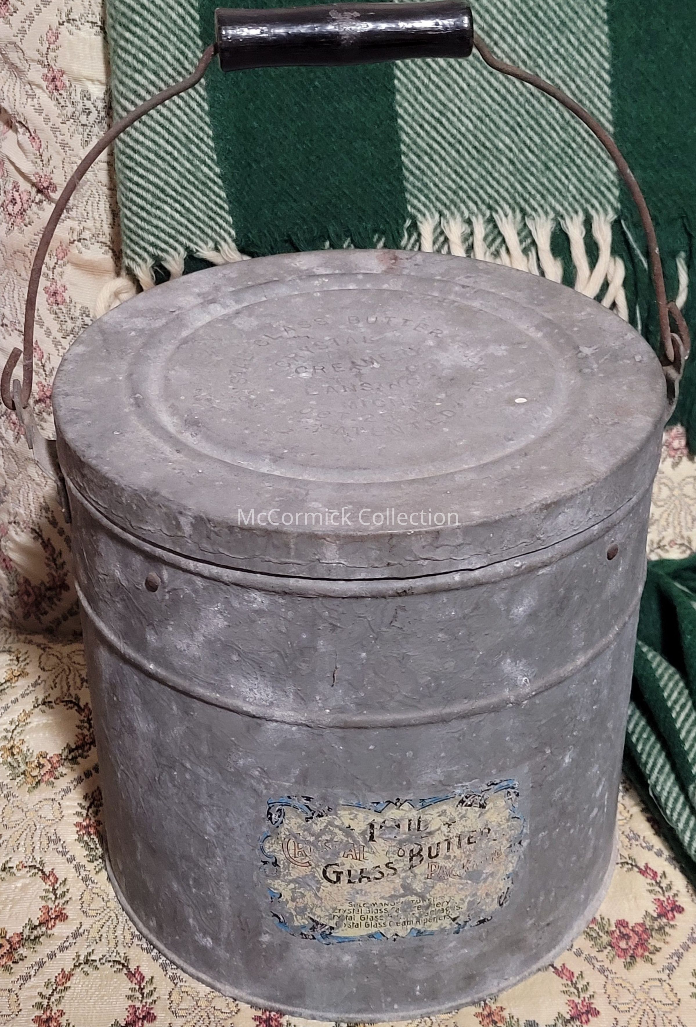 A metal pail with glass insert called the Crystal Glass Butter Package made by the Crystal Creamery of Lansing, Michigan. Circa 1892.