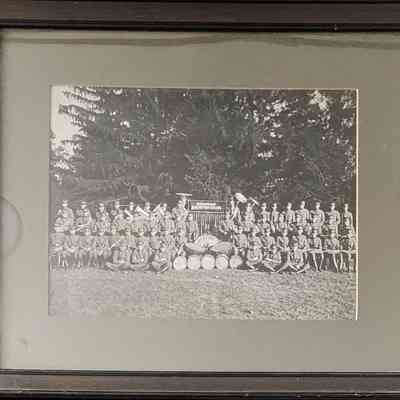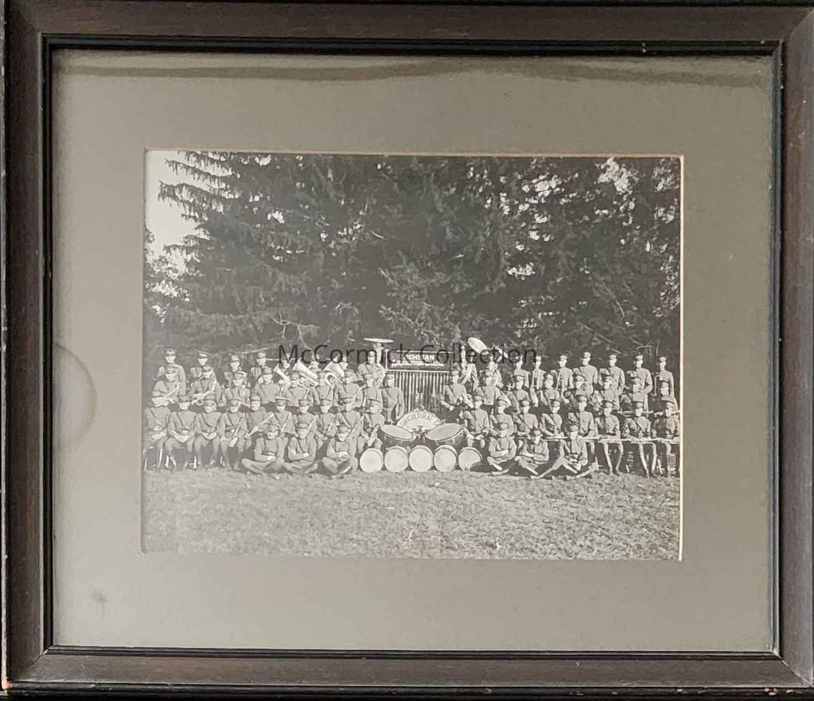 Framed photograph of the Michigan Agricultural College Band by an unknown photographer. Framed in Manistee, Michigan, likely because of a student Band member hailing from there.