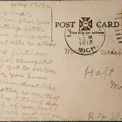 Postally used. Addressed to Mrs. Wichert, Holt, Mich. 1912.