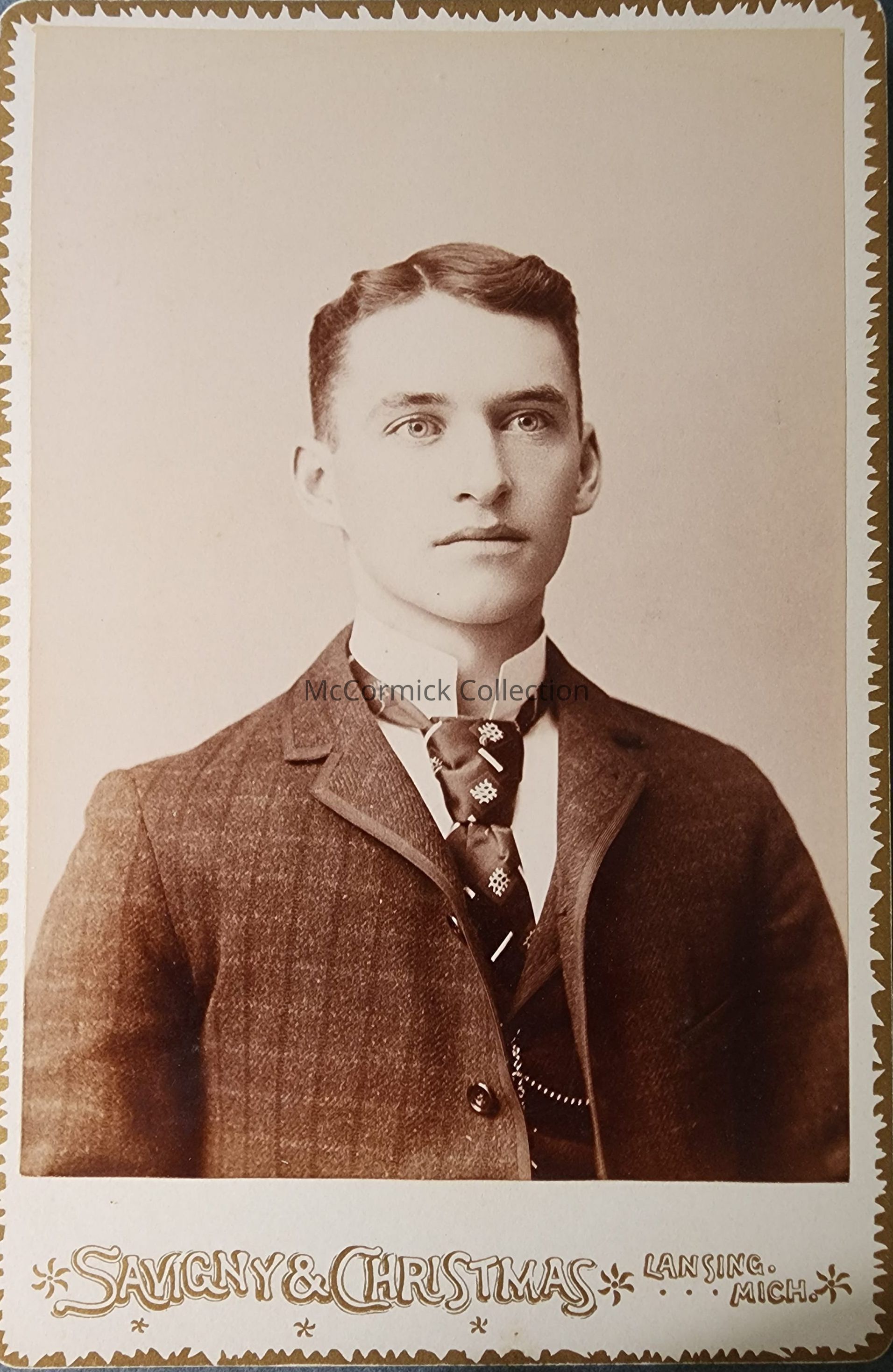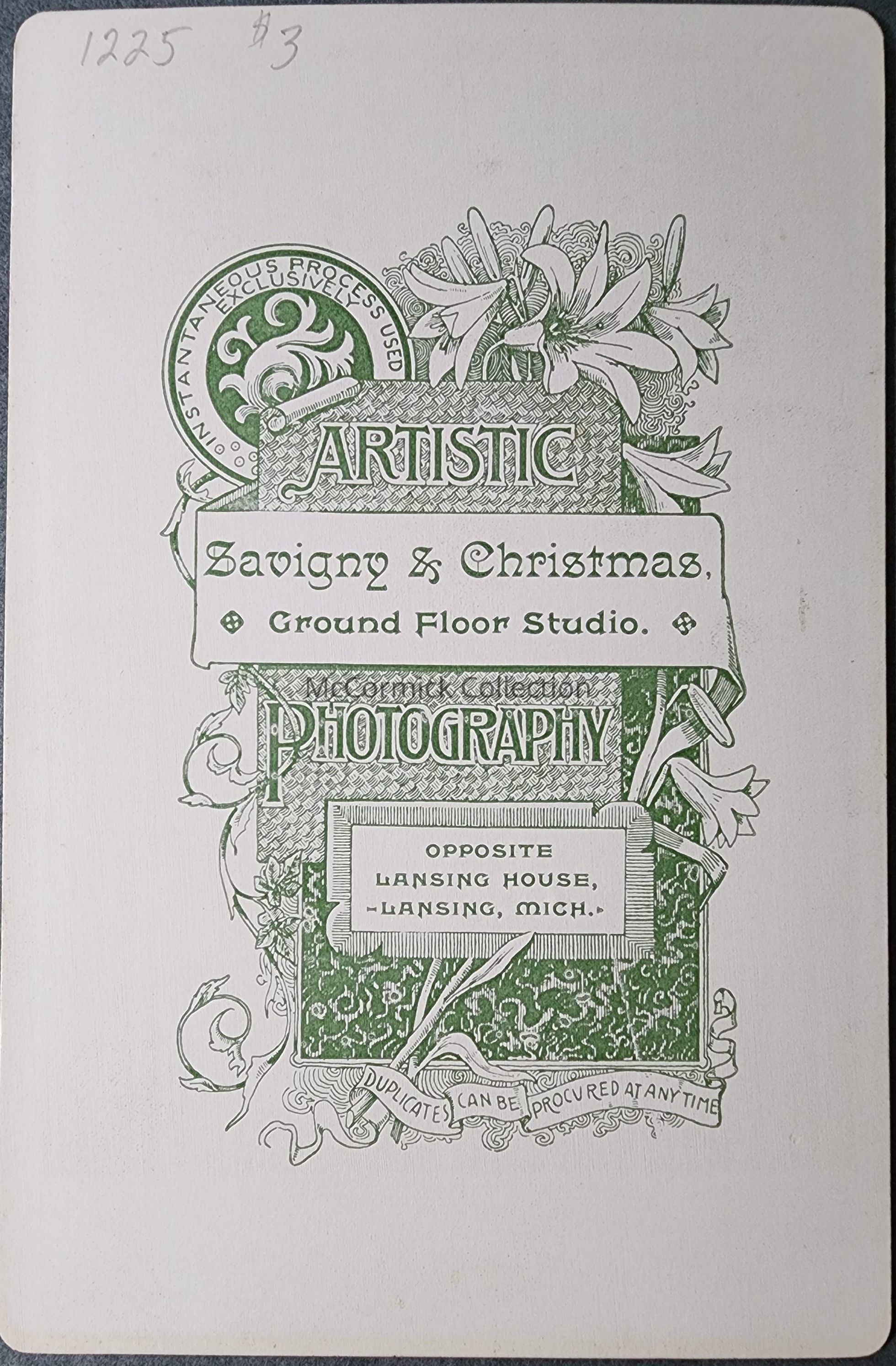 Cabinet card photograph of an unidentified man by Lansing photographer Savigny and Christmas.