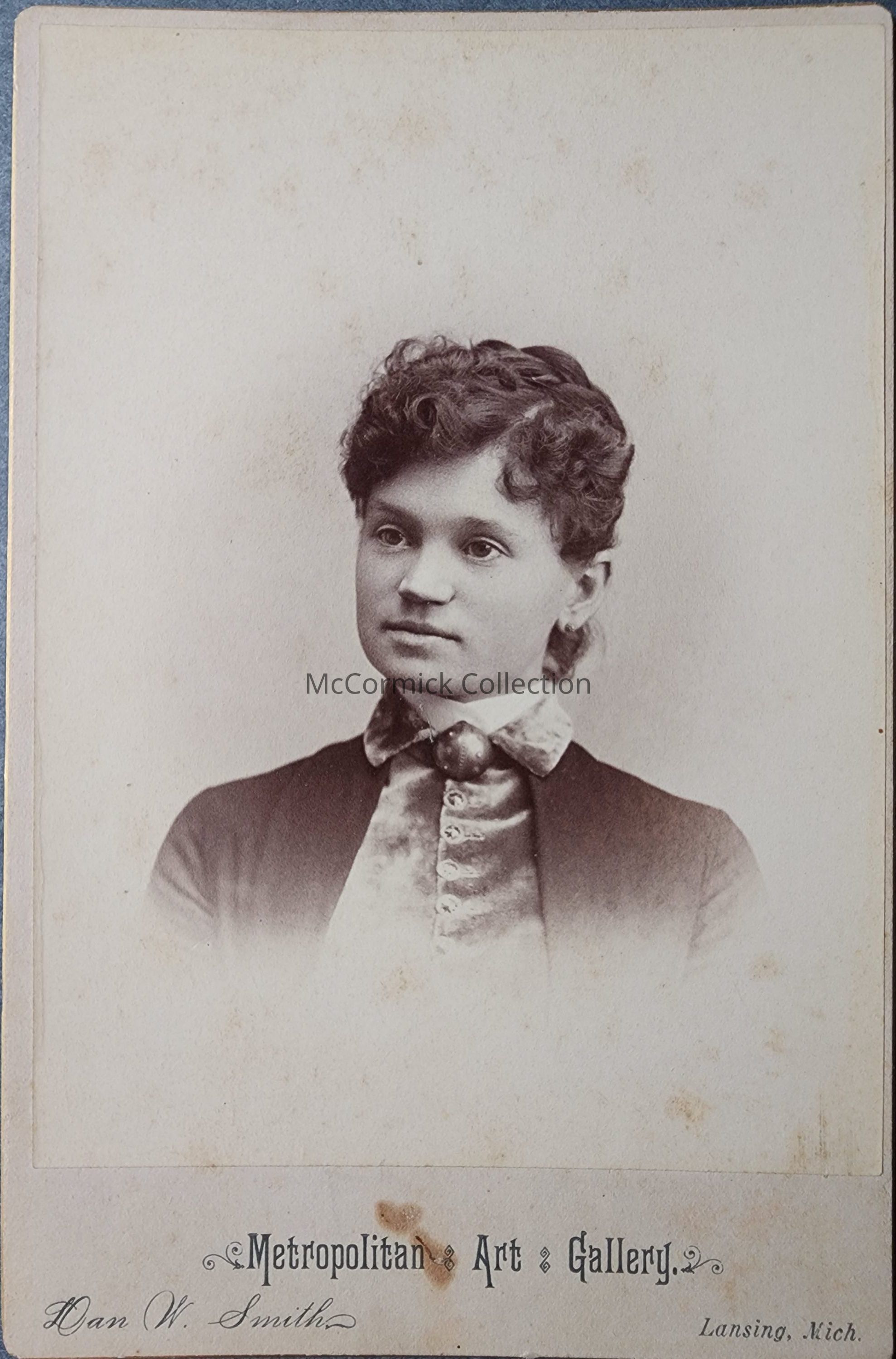 Cabinet card photograph of an unidentified woman by Lansing photographer Metropolitan Art Gallery, Dan W. Smith. Possibly an MAC student.Made/Created