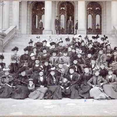 A card-mounted photograph of a group of women, possibly suffragists, gathered on the steps of the Michigan State Capitol. This photo is used in Heritage Hall.