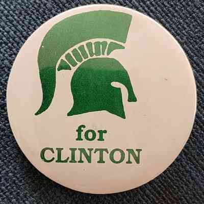 A 2.25" locally made green and white political button from the 1992 Presidential Debate held at Michigan State University. This button supports Bill Clinton for President, see the rest of the 3-piece set.