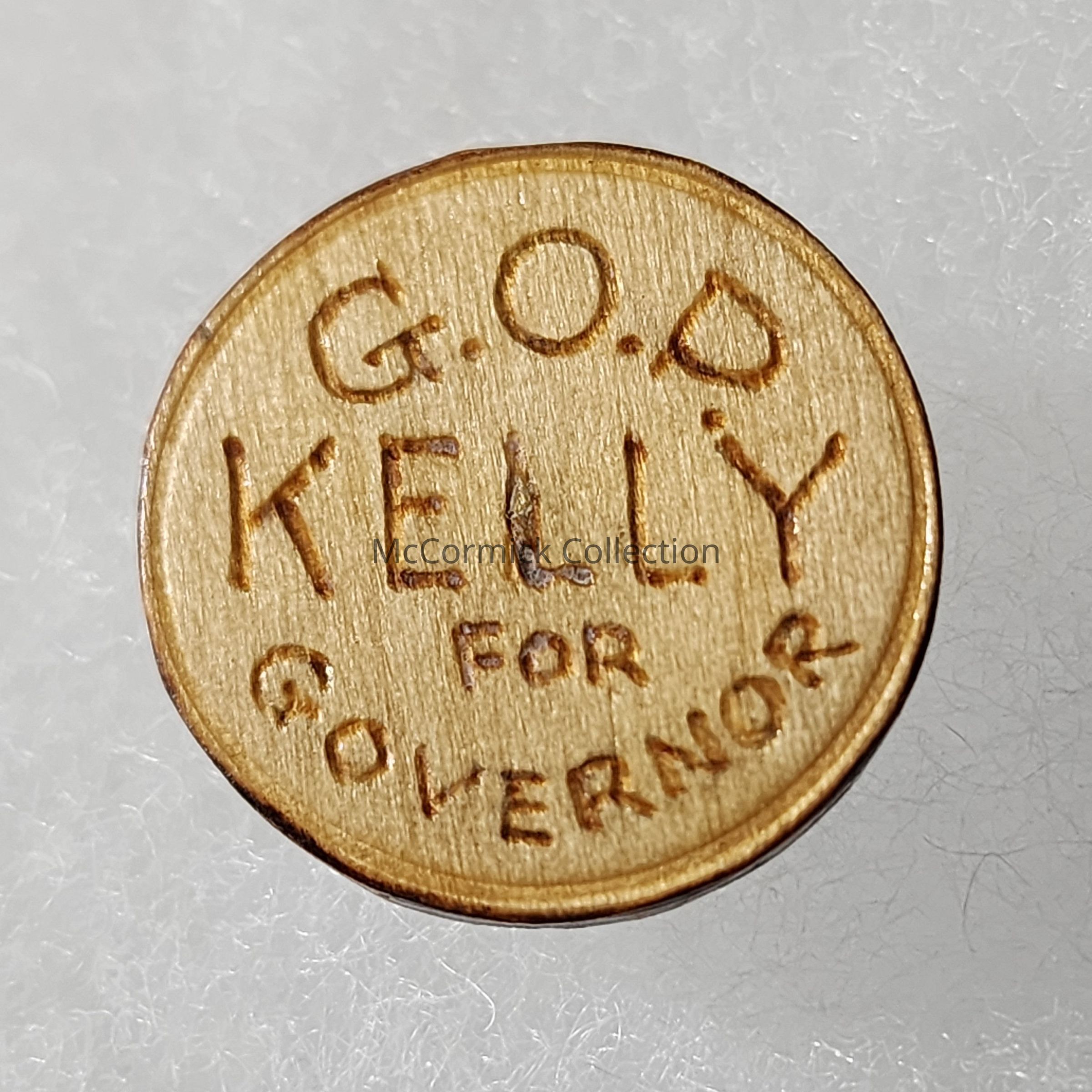 Wood folk art stud which reads "G.O.P. Kelly for Governor," for Harry Kelly for Governor of Michigan. Possibly one of a kind.