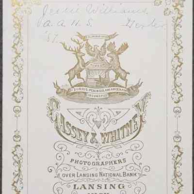 Cabinet card photograph of Jessie Williams of Dexter, graduate of Ann Arbor High School, and went on to Michigan Agricultural College, graduated in 1887. Photo by Lansing photographer Cassey and Whitney.