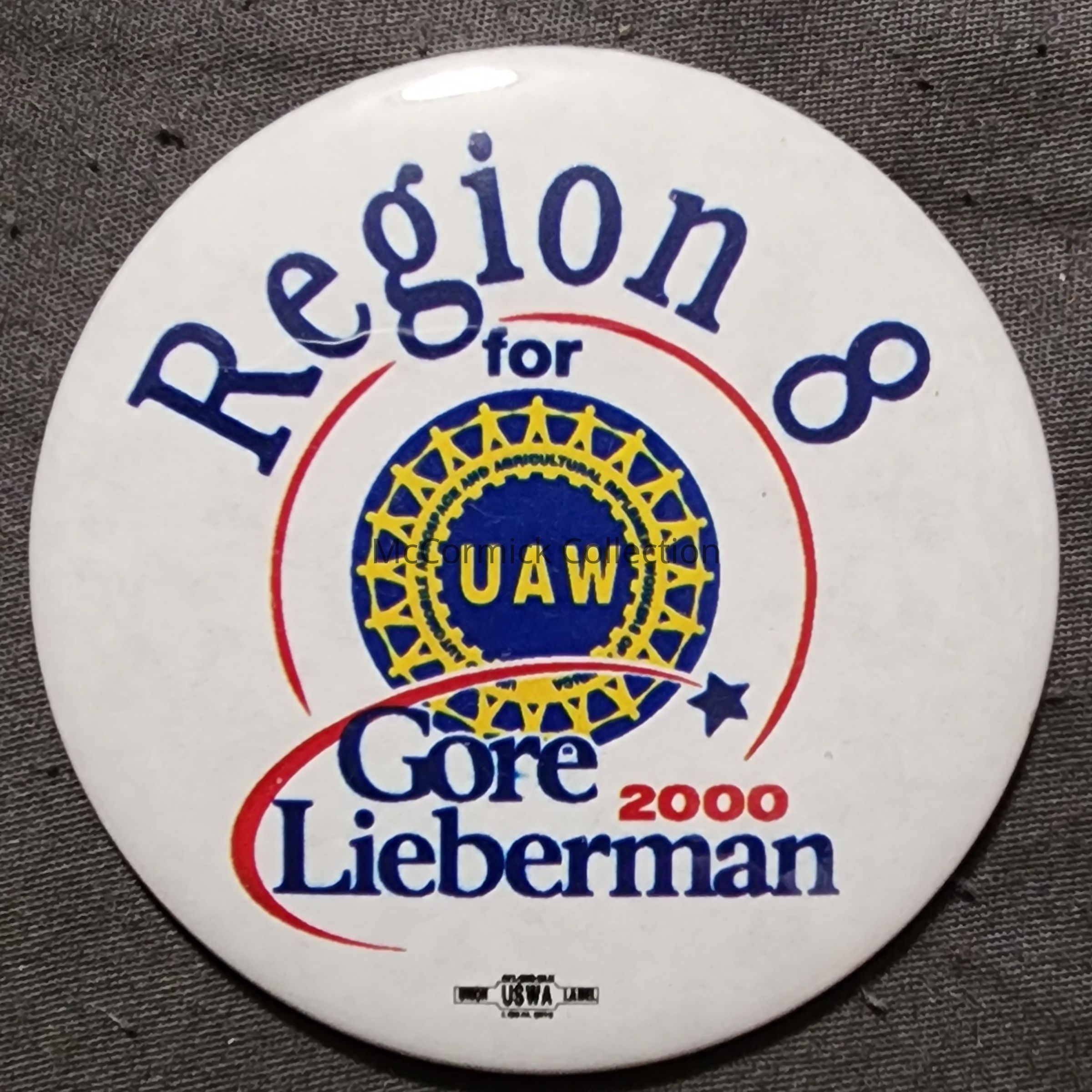 A 2.25" political button for UAW Region 8 supporting Al Gore and Joe Lieberman in 2000.