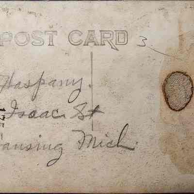 Real photo postcard of A.K. Haspany or Haspang and child on Isaac Street, Lansing, Michigan.