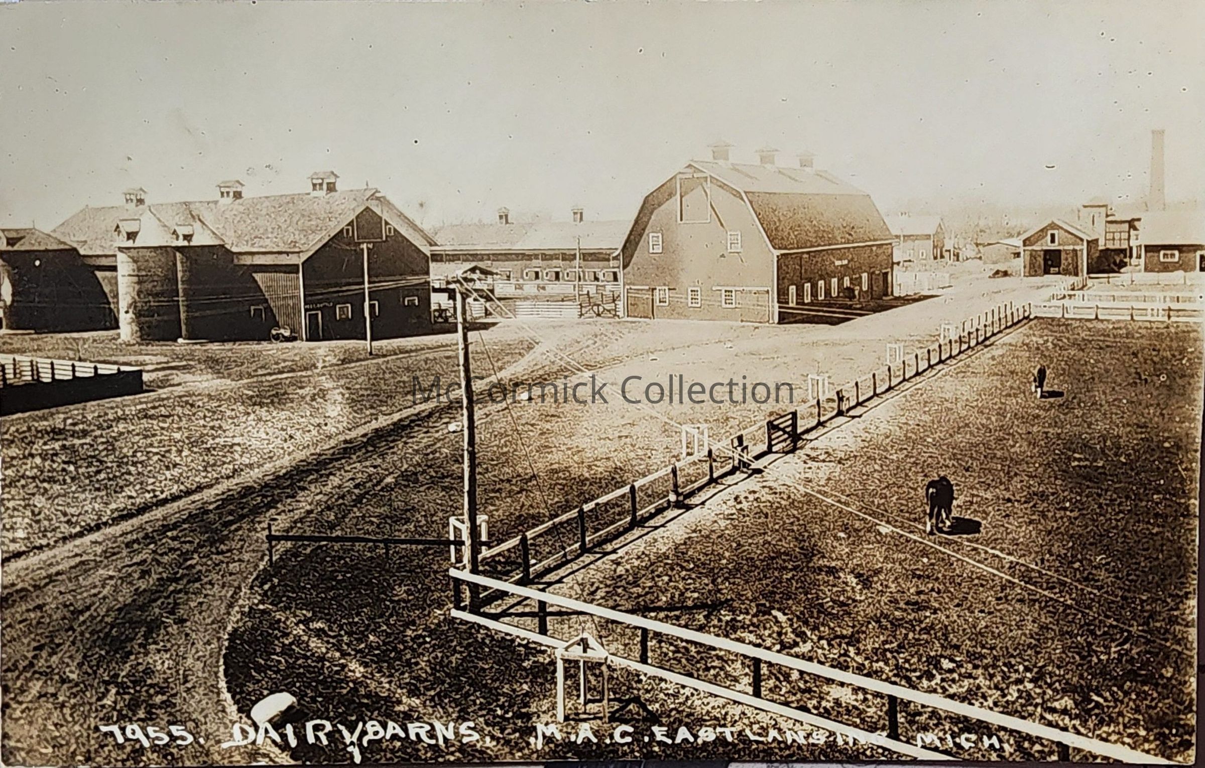 Real photo postcard of dairy barns at Michigan Agricultural College. Postmarked 1916 Lansing. Negative number is 7955. Possibly a Pesha photo.