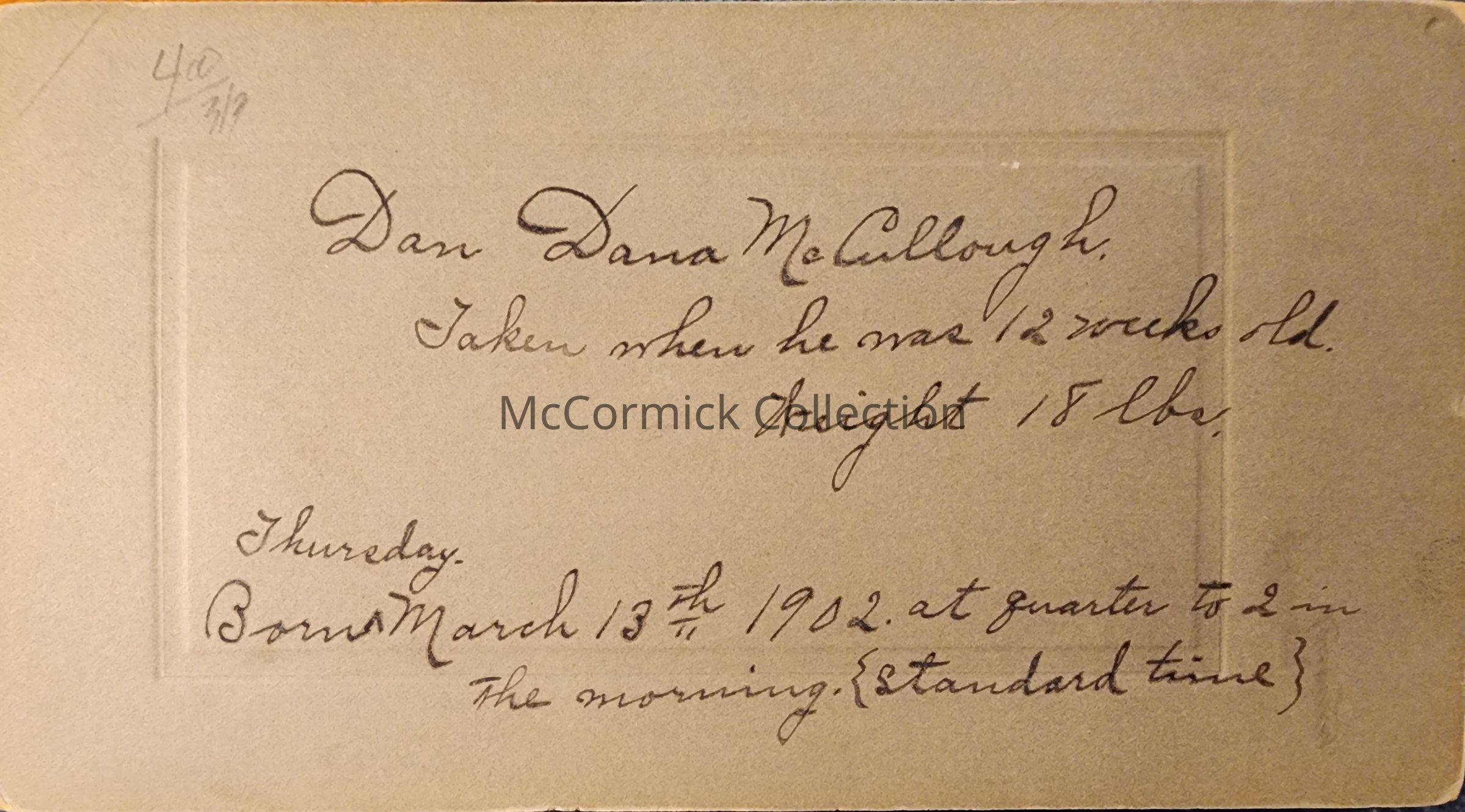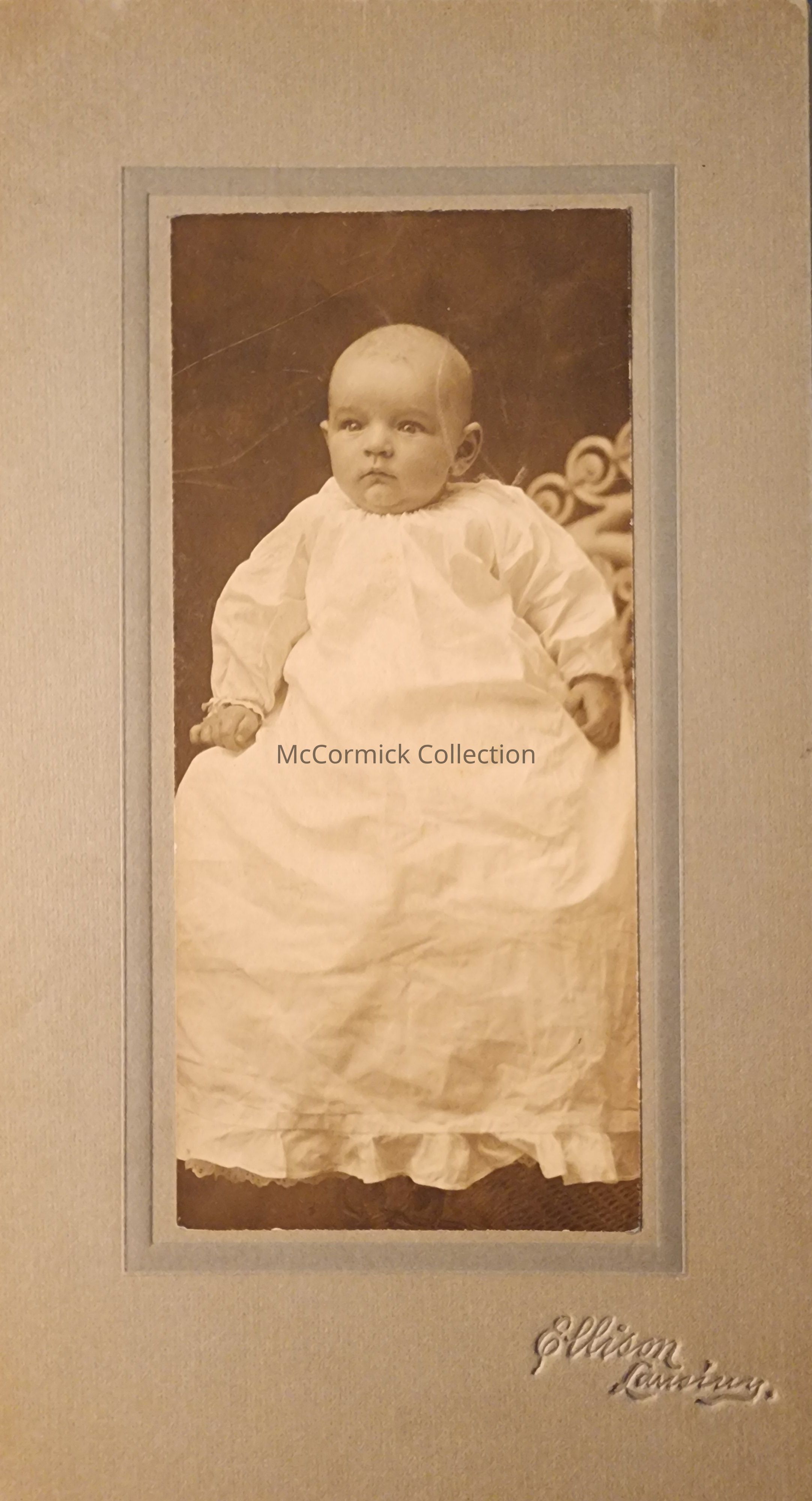 Card mounted photograph of an infant Dan Dana McCullough by Lansing photographer Ellison. Dated 1902.