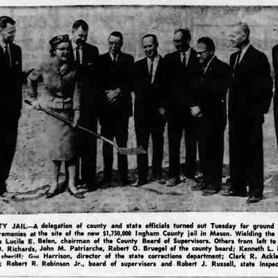 Oversize photographic print of the ground breaking of the new Ingham County Jail and Sheriff's Department in October 1963. Pictured are, left to right, Paul D.Richards, Lucille Belen, John M. Patriarche, Robert O. Bruegel, Sheriff Kenneth Preadmore, Gus Harrison, Clark Ackley, Robert Robinson, and Robert Russell.