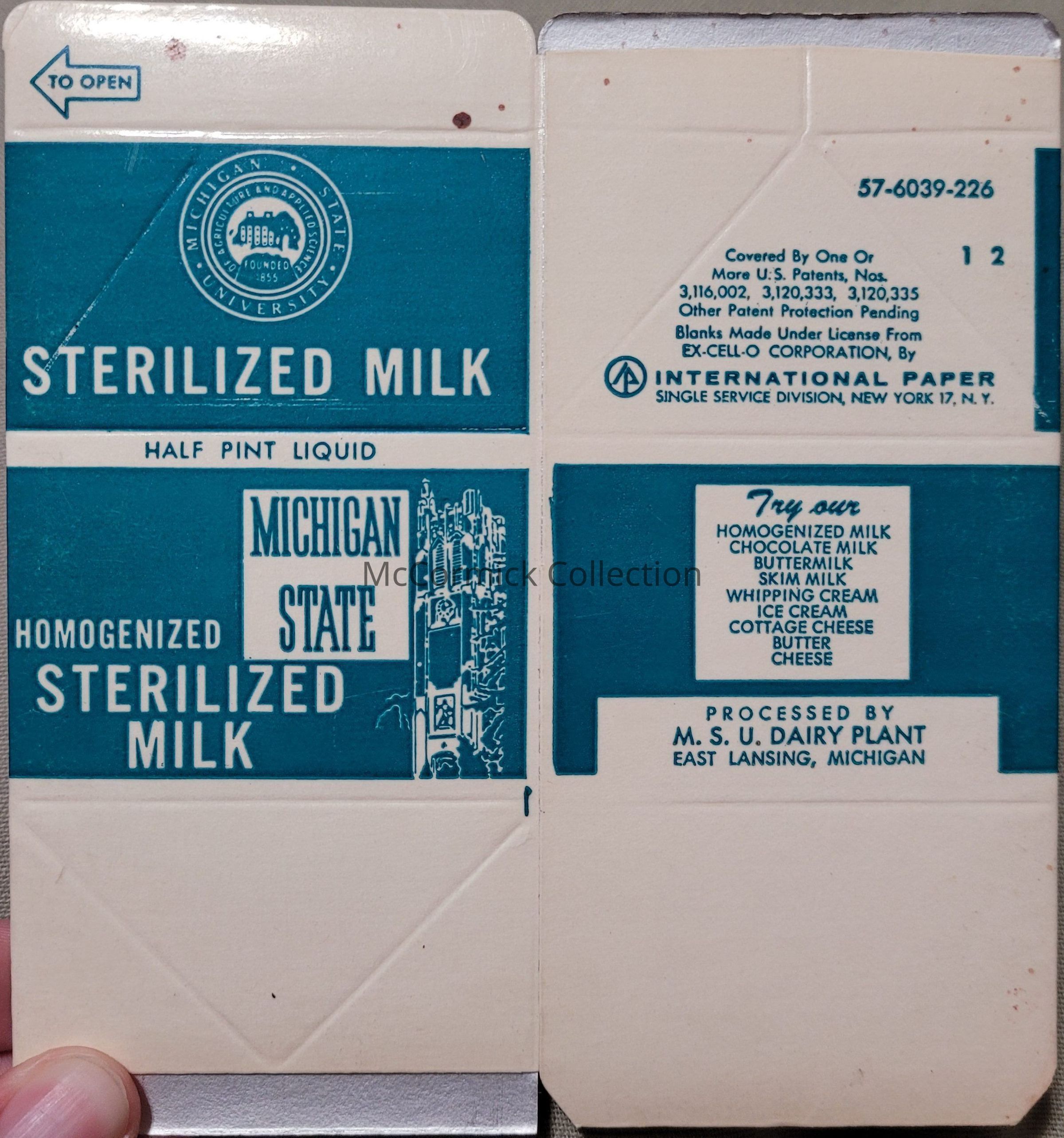 A cardboard carton from the Michigan State University Dairy Plant for Homogenized Sterilized Milk.