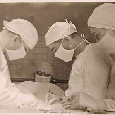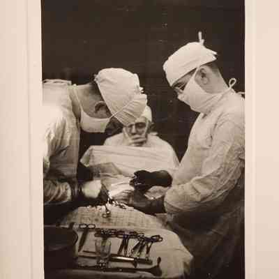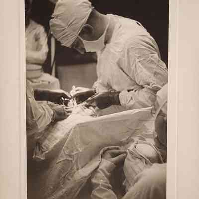 Group of 3 snapshot photographs of Dr. John Wellman performing a surgery in Lansing. Developed by Linn Photo Co., circa 1936.
