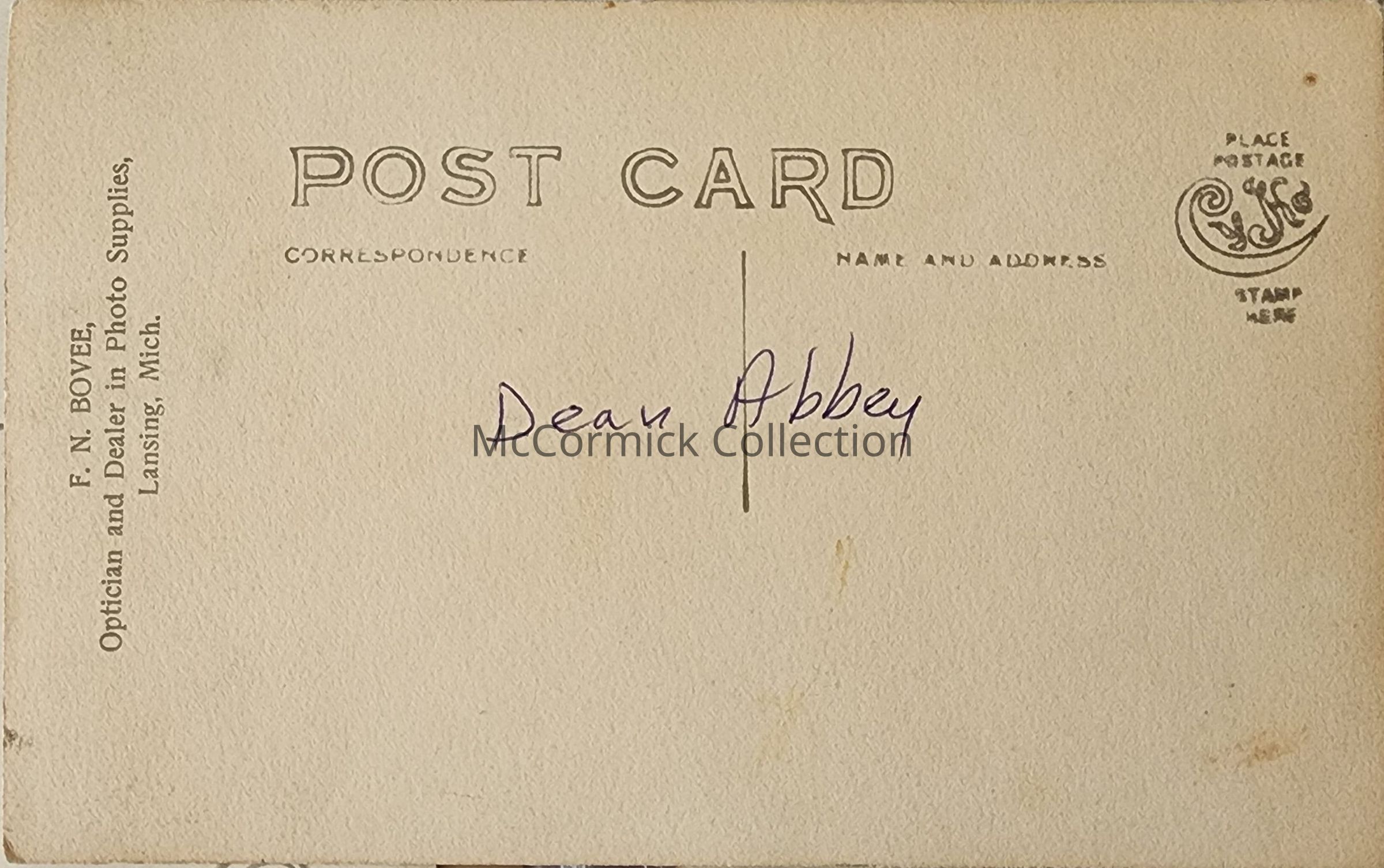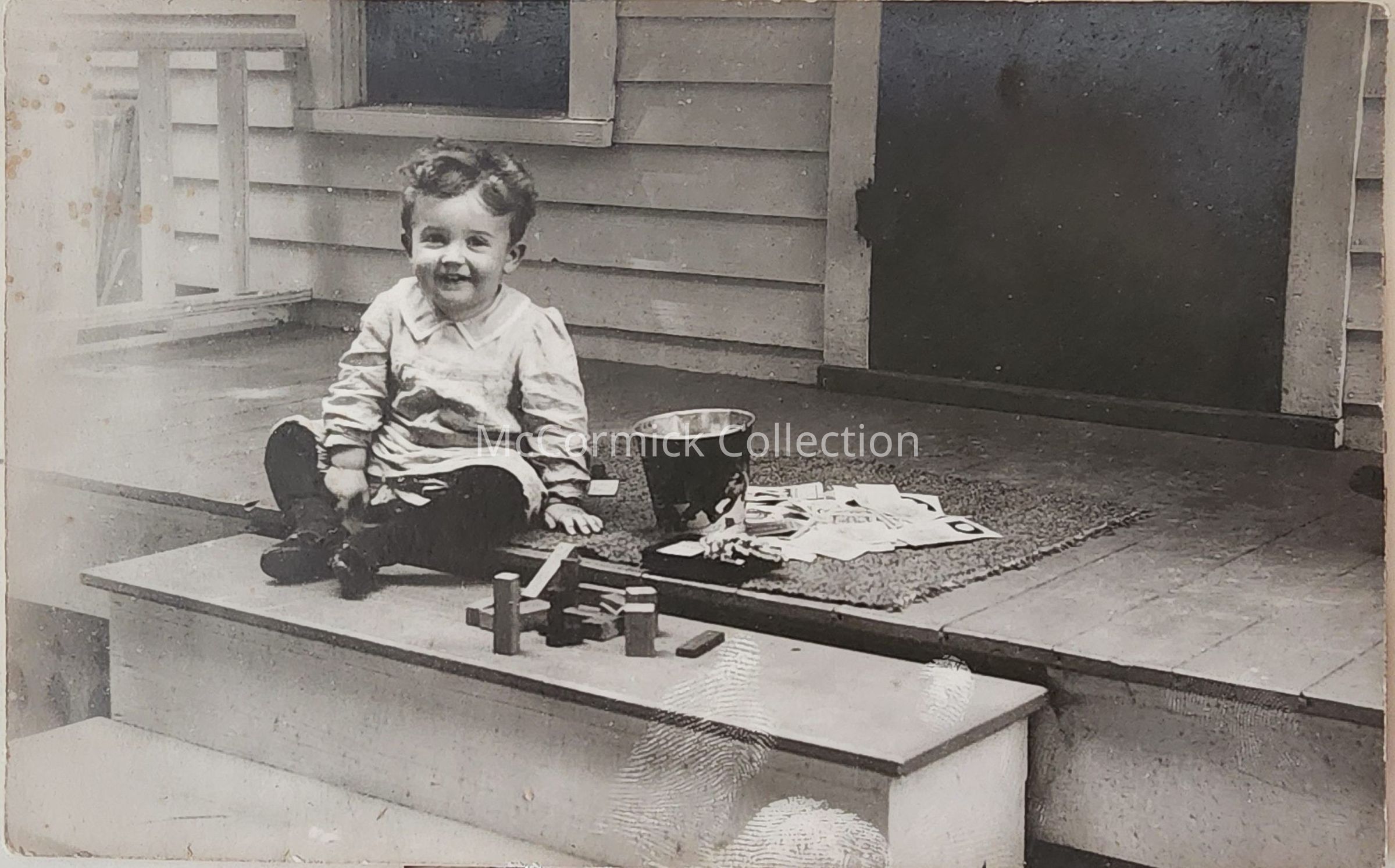 Real photo postcard of a Child, identified as Dear Abbey, sitting on a porch with toys by Lansing photographer Bovee.