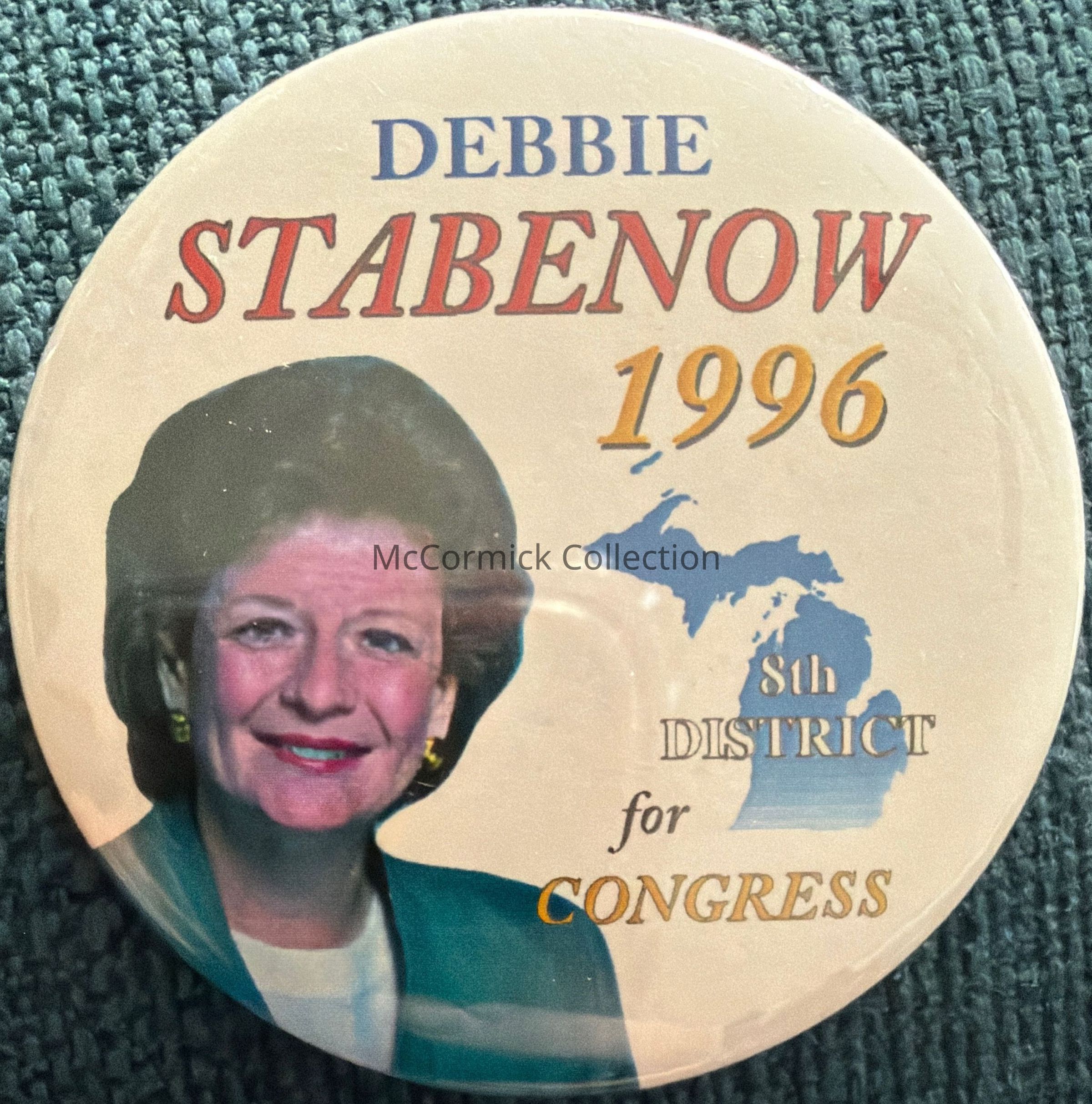 A 2.25" political picture button for Debbie Stabenow for U.S. Congress, Michigan 8th District, 1998.